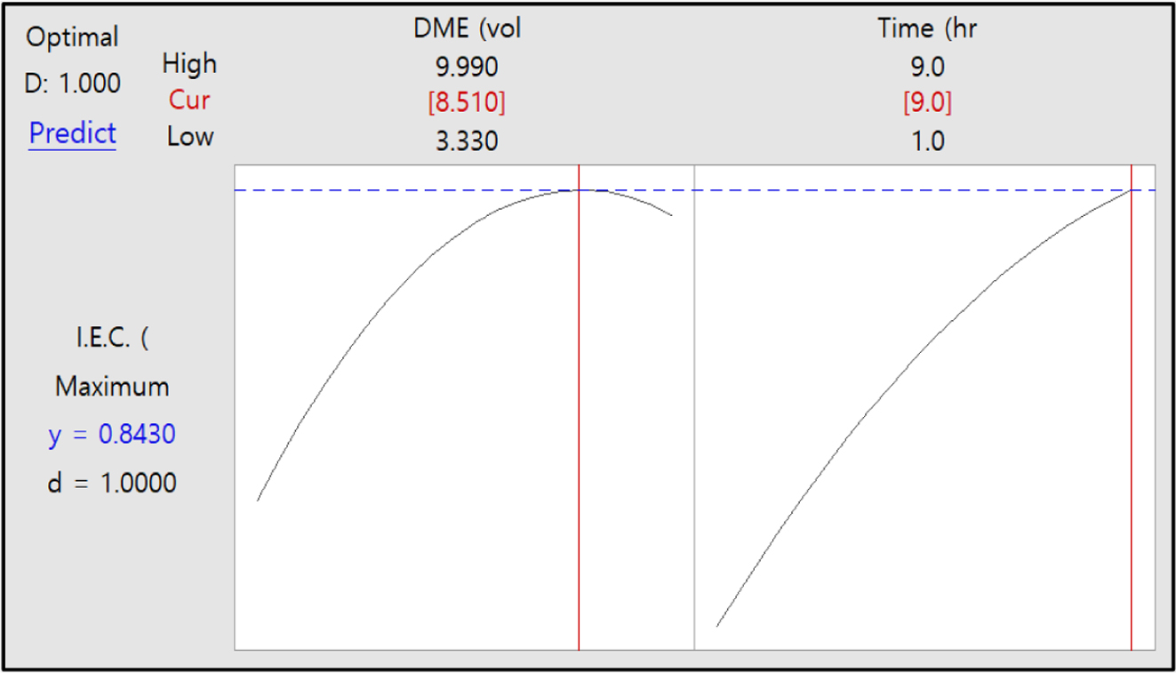 그리고 만족도 d 값은 1.0으로 이온교환용량 값을 증가시키기 위해서는 DME 농도를 9.99 vol%로 증가시키고 반응시간을 9시간으로 조절하면 이온교환용량을
