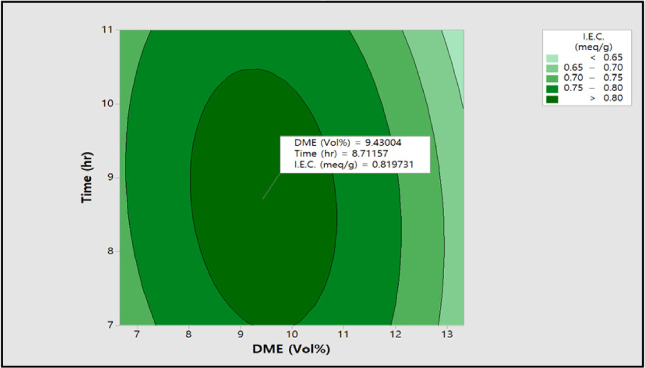 Figure 11 Contour plot of I.E.C. (meq/g) vs time (h), DME (vol%). |