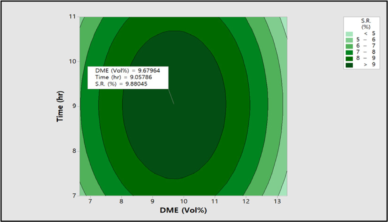 Figure 14에 나타낸 바와 같이 DME 9.68 vol%, 반응시간 9.05시간에서 9.8%로 나타났다. 그리고