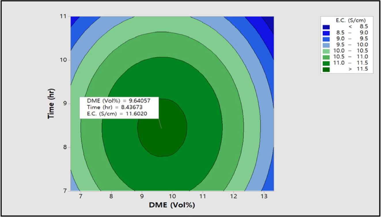 Figure 15 Contour plot of E.C. (S/cm) vs time (h), DME (vol%). |