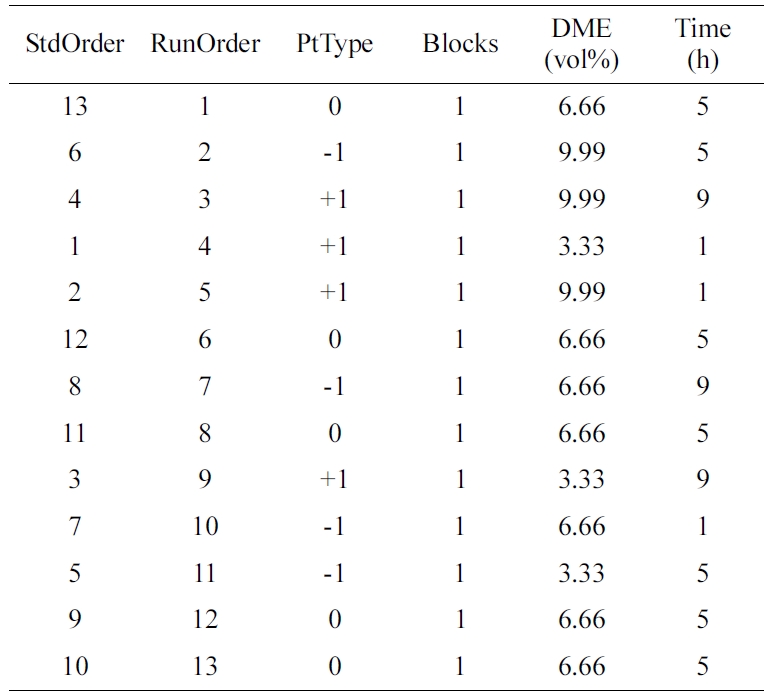 Response optimization에서 제시된 two factorial 범위에서 반응조건을 DME 6.66, 9.99, 13.32 vol%와