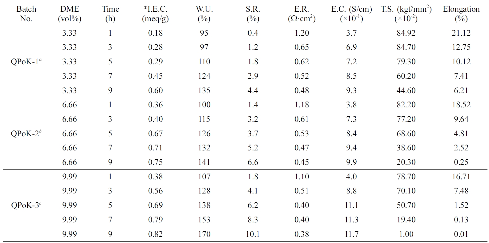 *I.E.C.: Ion exchange capacity, W.U.: Water uptake, S.R.: Swelling ratio, E.R.: Electric resistance, E.C.: Electric conductivity, T.S.: Tensile strength. aQPoK-1: DME content=3.33 vol%, Temp.=70 oC. bQPoK-2: DME content=6.66 vol%, Temp.=70 oC. cQPoK-3: DME content=9.99 vol%, Temp.=70 oC. |