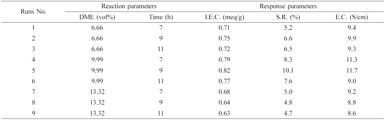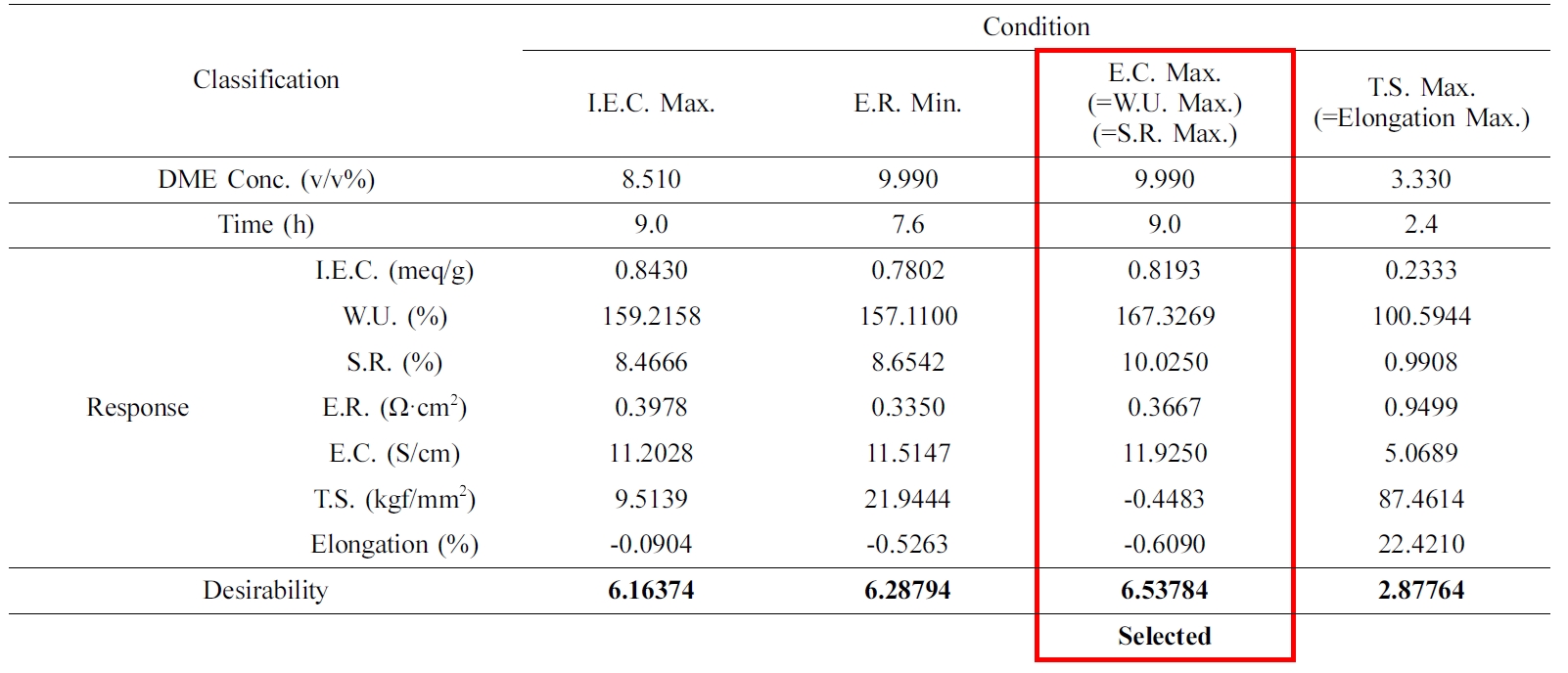 내용이다. 이 조건에서 얻은 이온교환막의 주요 특성성분인 이온교환용량, 팽윤율, 전기전도도를 선정하고 실험을 진행하여 유효성 검증을 실시한 것이다.
