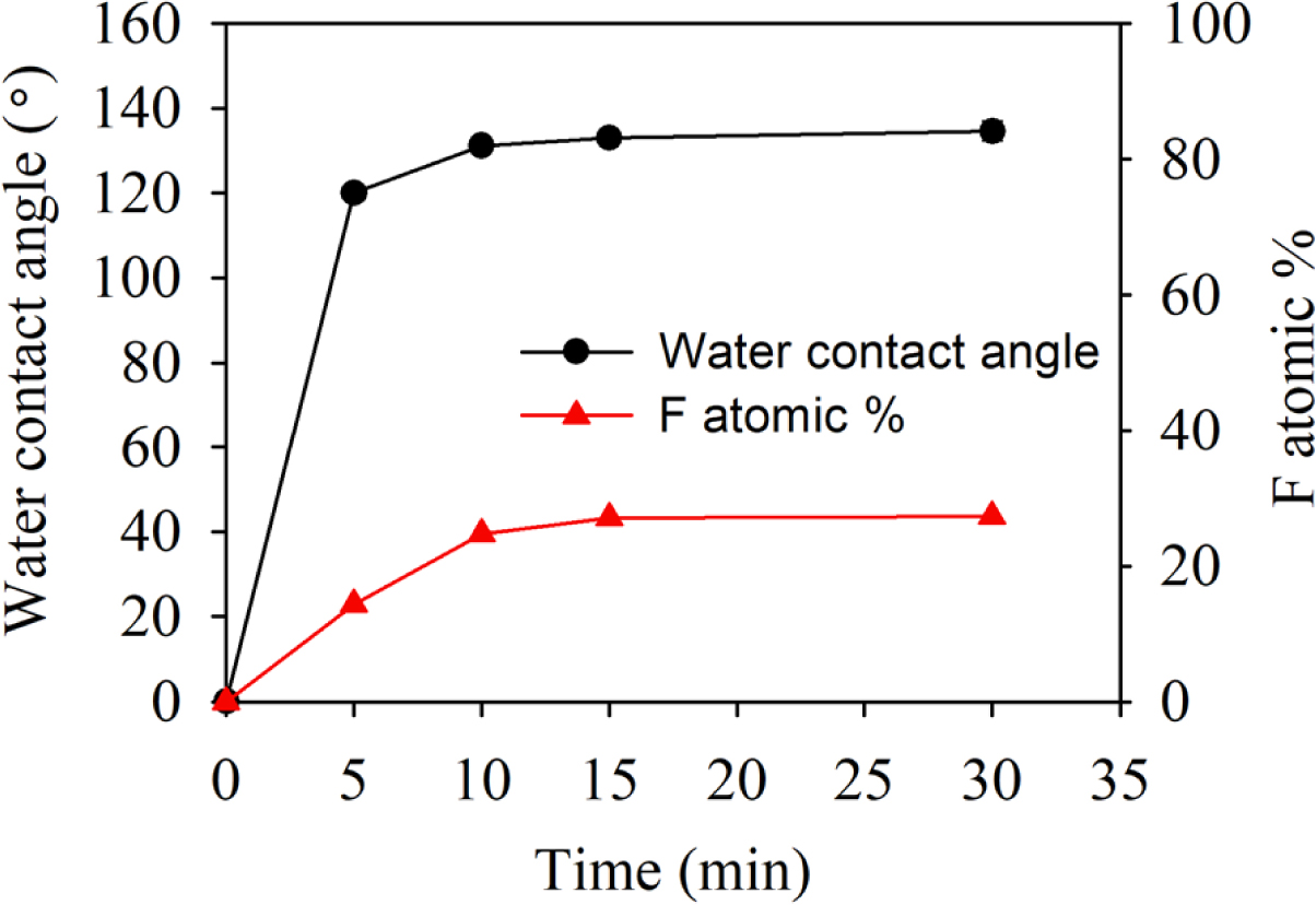 Figure 1 Effect of PFOA treatment time on the water contact angle and F atomic%. Concentration and pH of PFOA solution was 30 and 7.6 mM, respectively. |