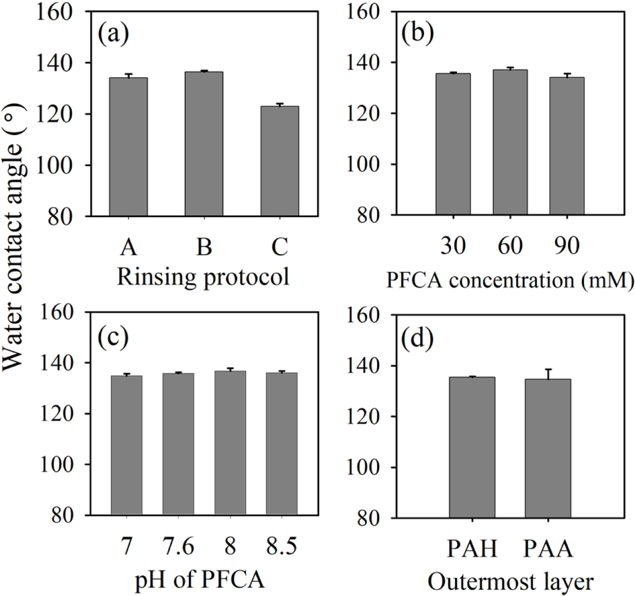Figure 2 Effect of (a) water rinsing/dry protocol, after acid treatment, where A: rinse, no dry, B: no rinse, no dry C: rinse + dry at 80 oC; (b) concentration; (c) pH of PFOA solution; ( d ) outermost layer of LbL film on the water contact angle. Unless specified, the samples were acid-treated at pH 2.4 for 1 h, and treated in PFOA solution of pH 7.6 and 30 mM for 30 min. |