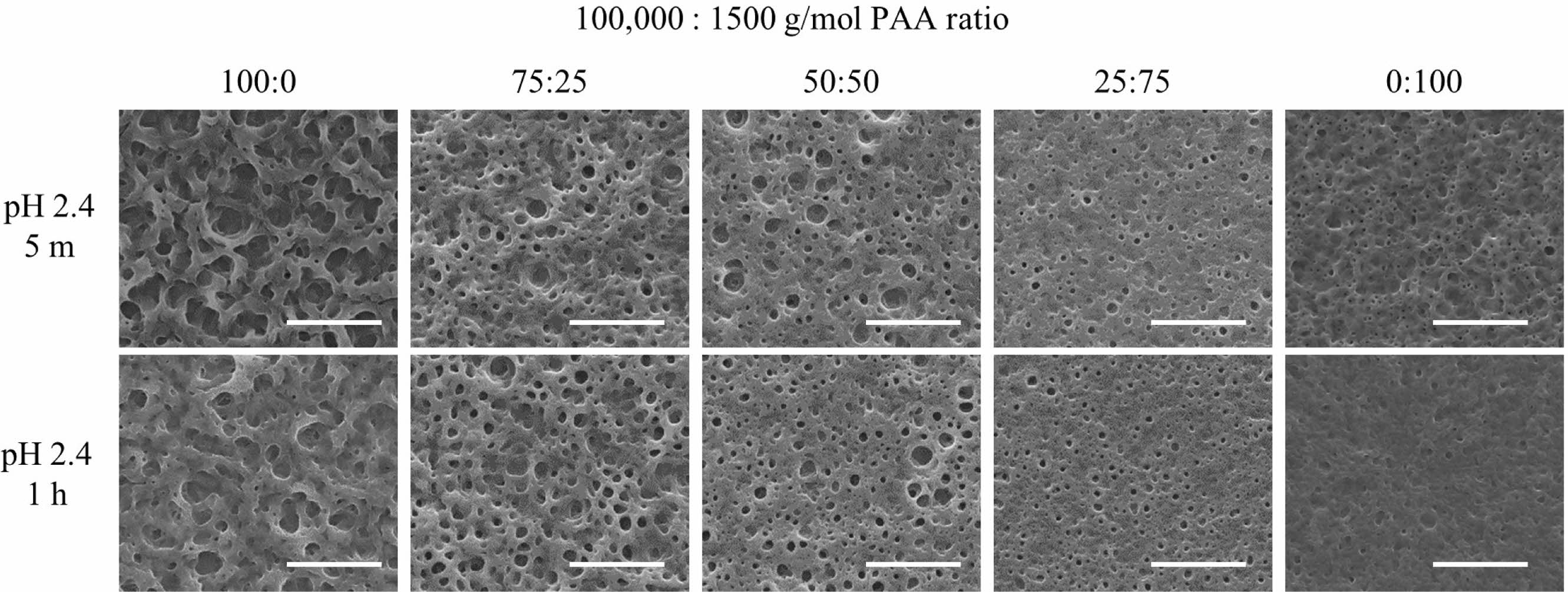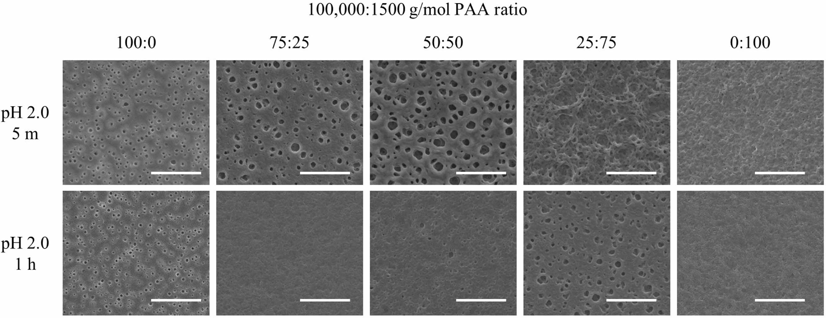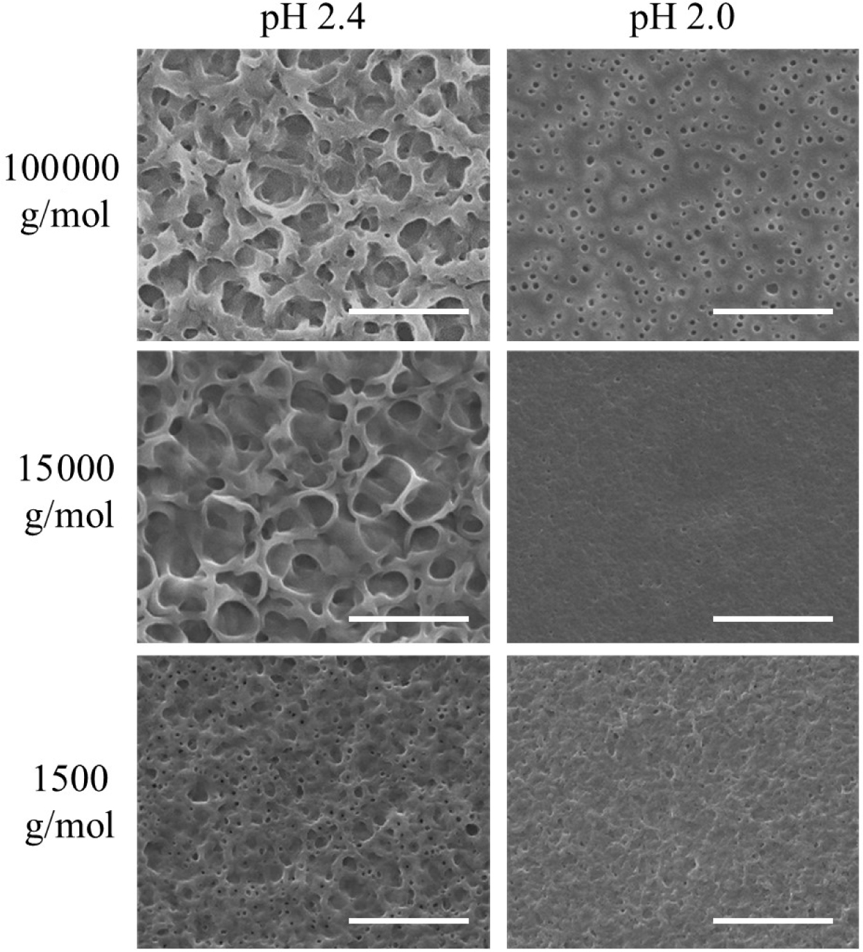Figure 3 SEM image of LbL films prepared with 100000, 15000, and 1500 g/mol PAA and acid-treated at pH 2.4 and pH 2.0. Acid treatment time was 5 min. The scale bar is 10 μm. |