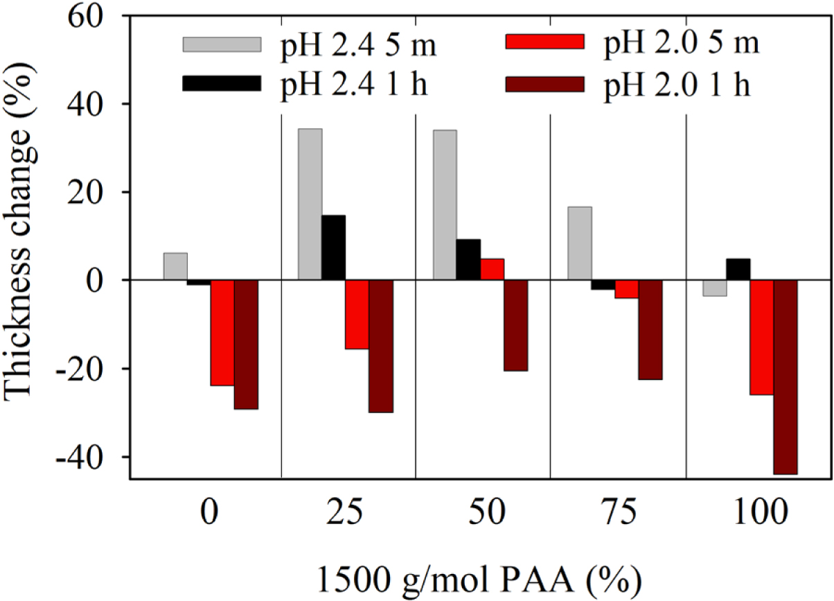 감소하였다. pH 2.0에서 산처리 시간이 5분인 경우, 1500 g/mol의 함량이 0% 또는 100%로 높거나 낮은 경우, 두께가 20% 감소하였으나, 1500 g/mol PAA의 함량이 25-75% 수준인 경우 두께