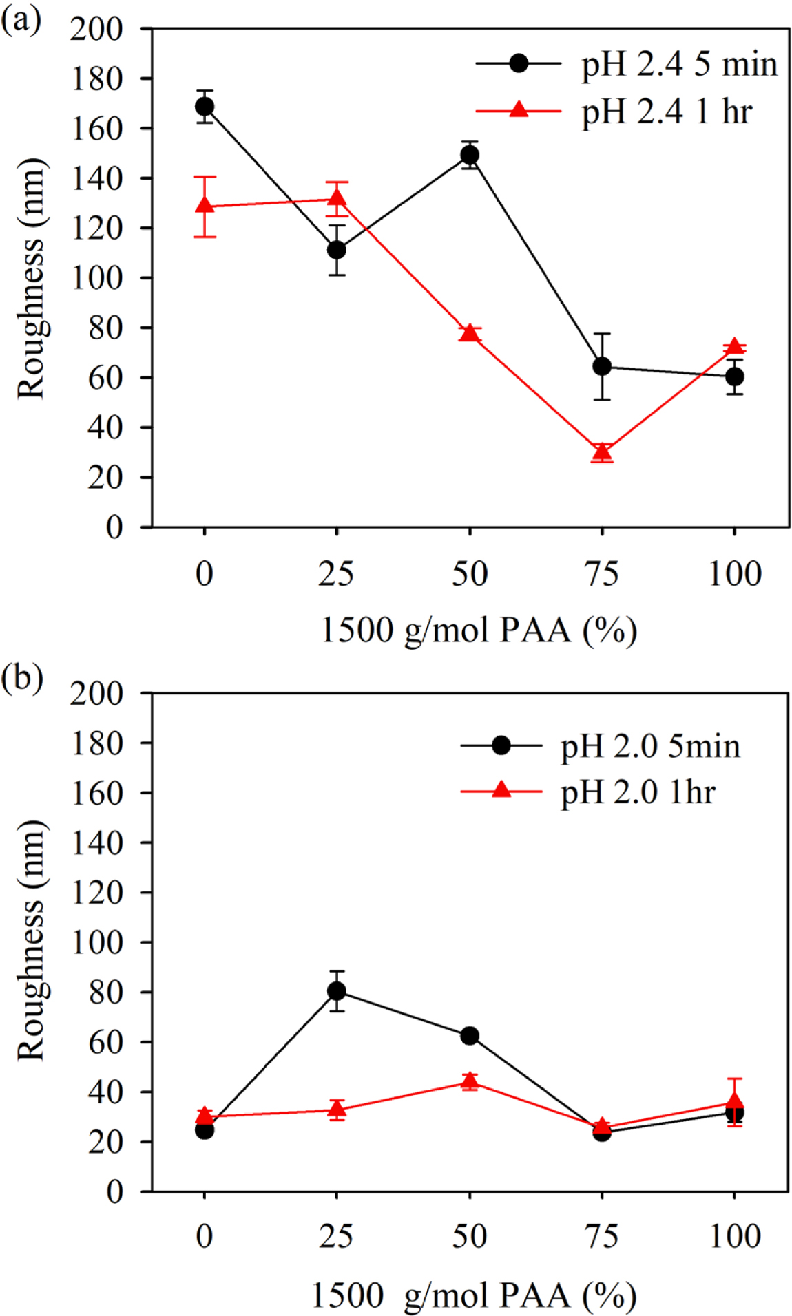 25와 50%로 증가함에 따라, 조도도 80과 62 nm로 상승하였다. 그러나 1500 g/mol PAA가 100%로 증가한 경우, 조도는