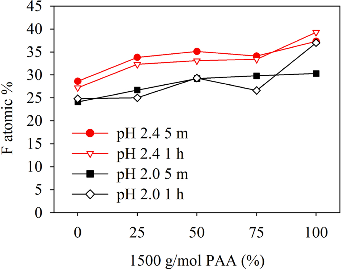 조건에 관계없이 1500 g/mol PAA 함량이 증가함에 따라 F 원자함량이