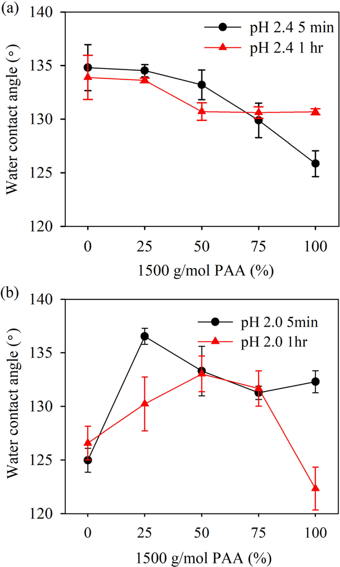 경우, 1500 g/mol PAA 함량이 증가함에 따라 표면 조도와 접촉각이 감소하였고, pH 2.0인 경우, 1500 g/mol PAA의 함량이 25-50% 영역에서 표면조도와 접촉각이 최대값을 나타내었다.