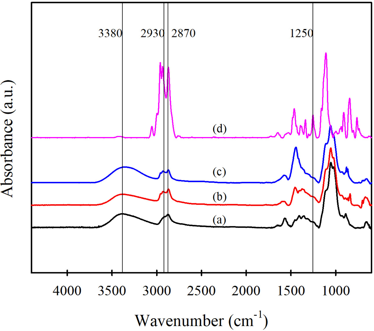 Figure 1 FTIR spectra of (a) HEC; (b) H0.33-HEC; (c) H0.58-HEC; (d) BGE. |