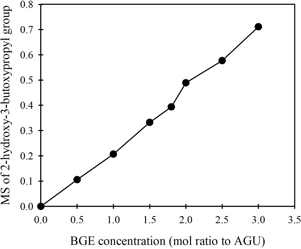 Figure 3 Increase in molar substitution (MS) of 2-hydroxy-3-butoxypropyl group in H-HEC with increasing BGE concentration. |
