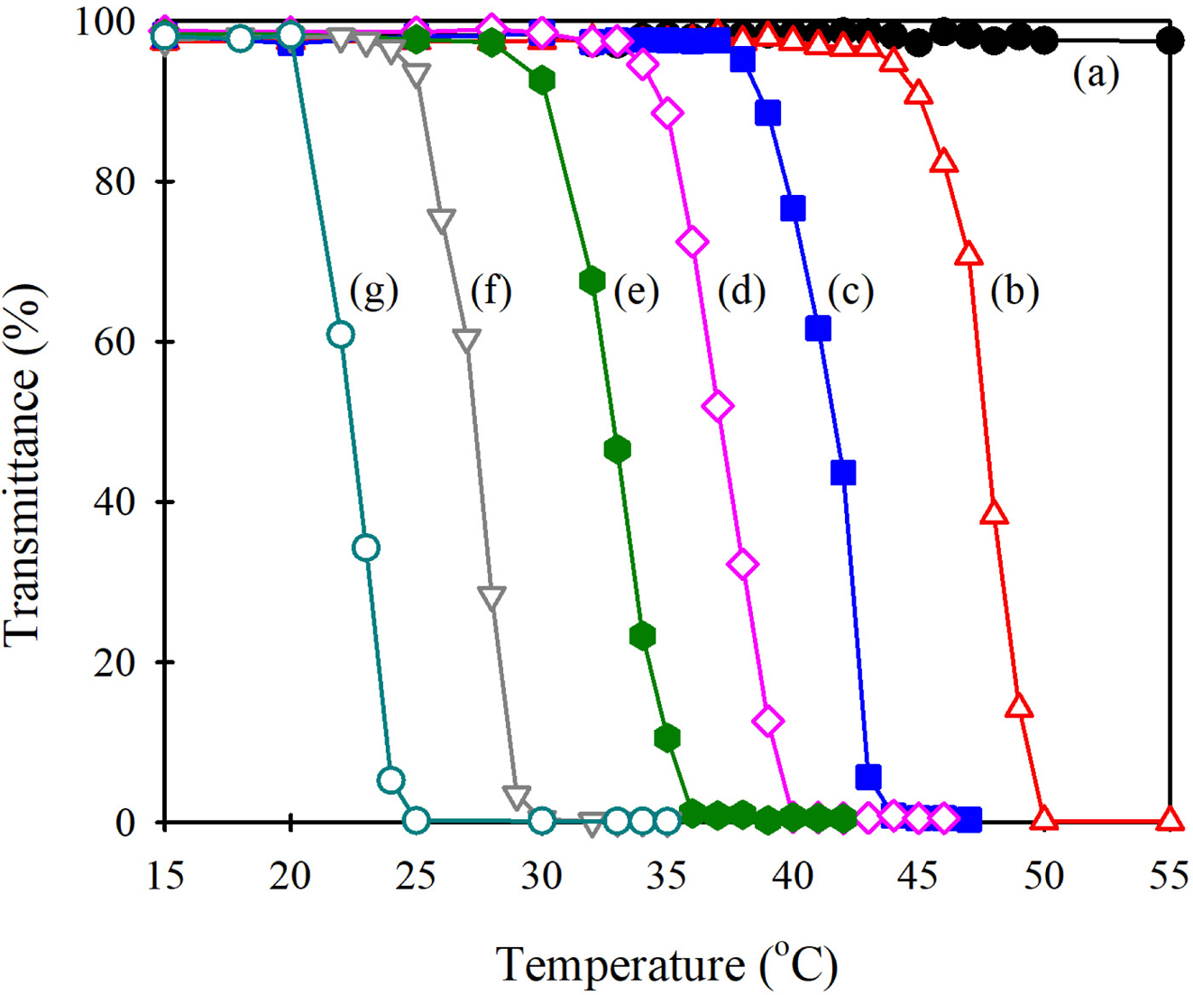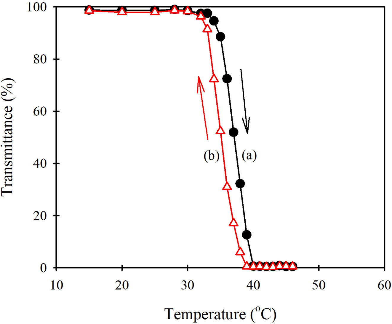 투과도를 나타낸 Figure 7을 보면, 승온 과정에서의 LCST는 약 37 oC이었지만 강온 과정에서의 LCST는 약 35 oC인 히스테리시스 현상이 나타났다. 이는 LCST 이상에서