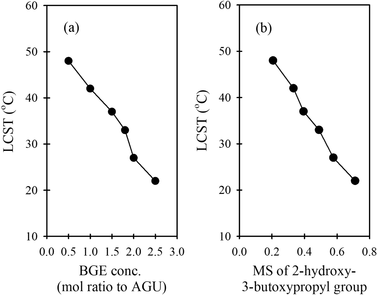 Figure 5 LCST change of H-HEC aqueous solution (a) with increasing BGE concentration; (b) with increasing MS of 2-hydroxy-3-butoxypropyl group. |