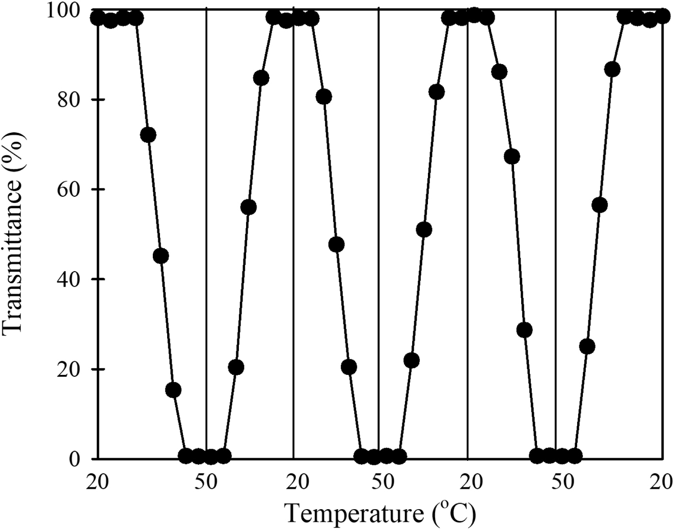 Figure 6 Reversible change in light transmittance of H0.39-HEC aqueous solution at 590 nm when the solution temperature is repeatedly increased and decreased. |