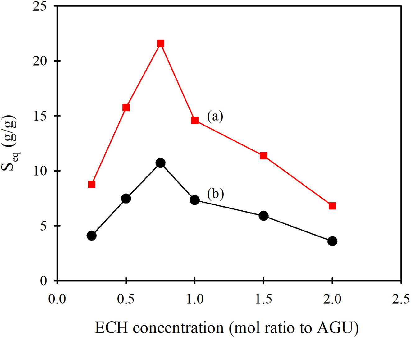 Figure 8 Changes in swelling ratio (Seq) of CE-H0.39-HEC hydrogel swollen in distilled water (a) below LCST (at 25 oC); (b) above LSCT (at 50 oC) with ECH concentration. |