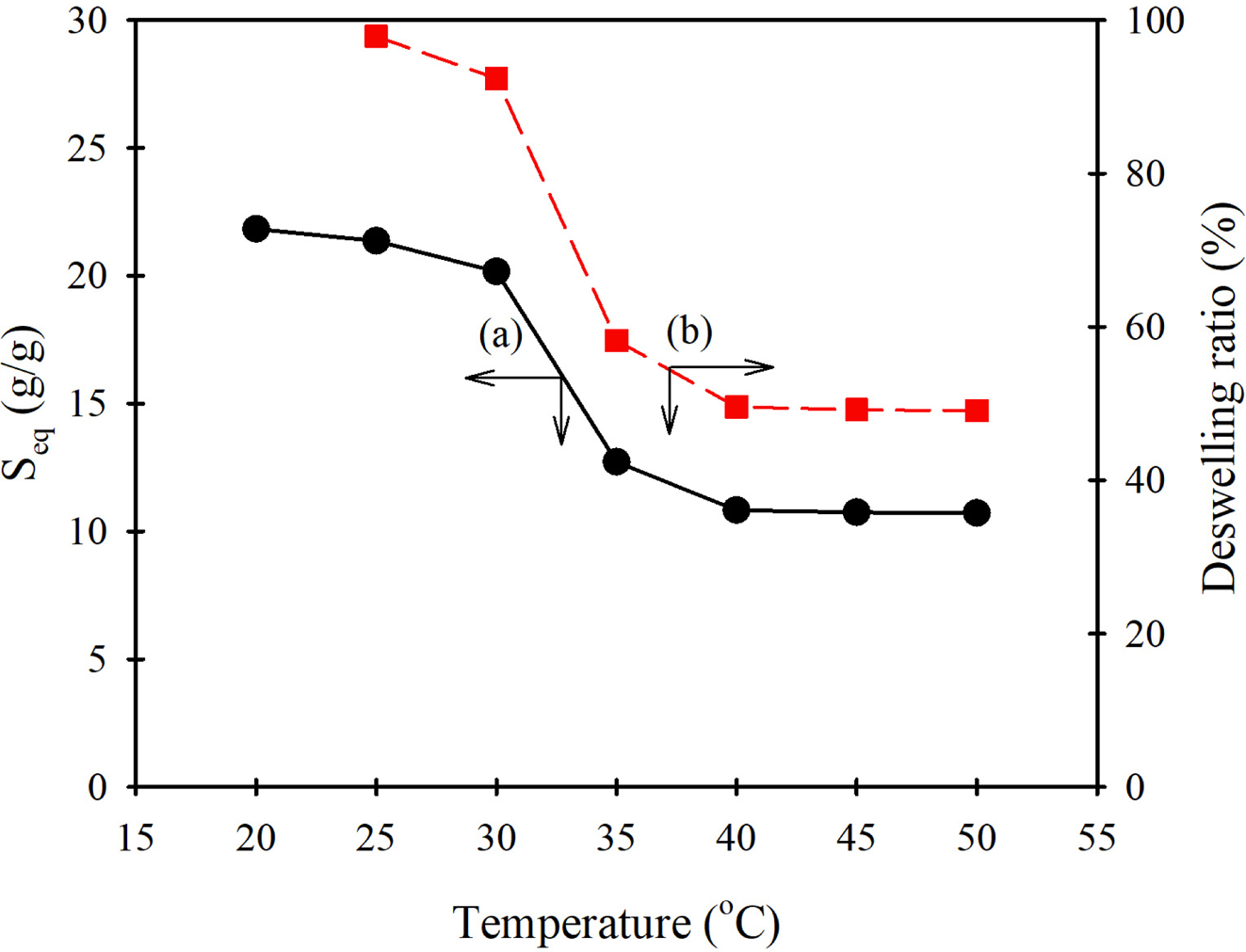 수화젤을 여러 온도의 증류수에서 팽윤비(Seq)를 측정하여 Figure 9(a)에 나타내었다. 물에 용해되었다가