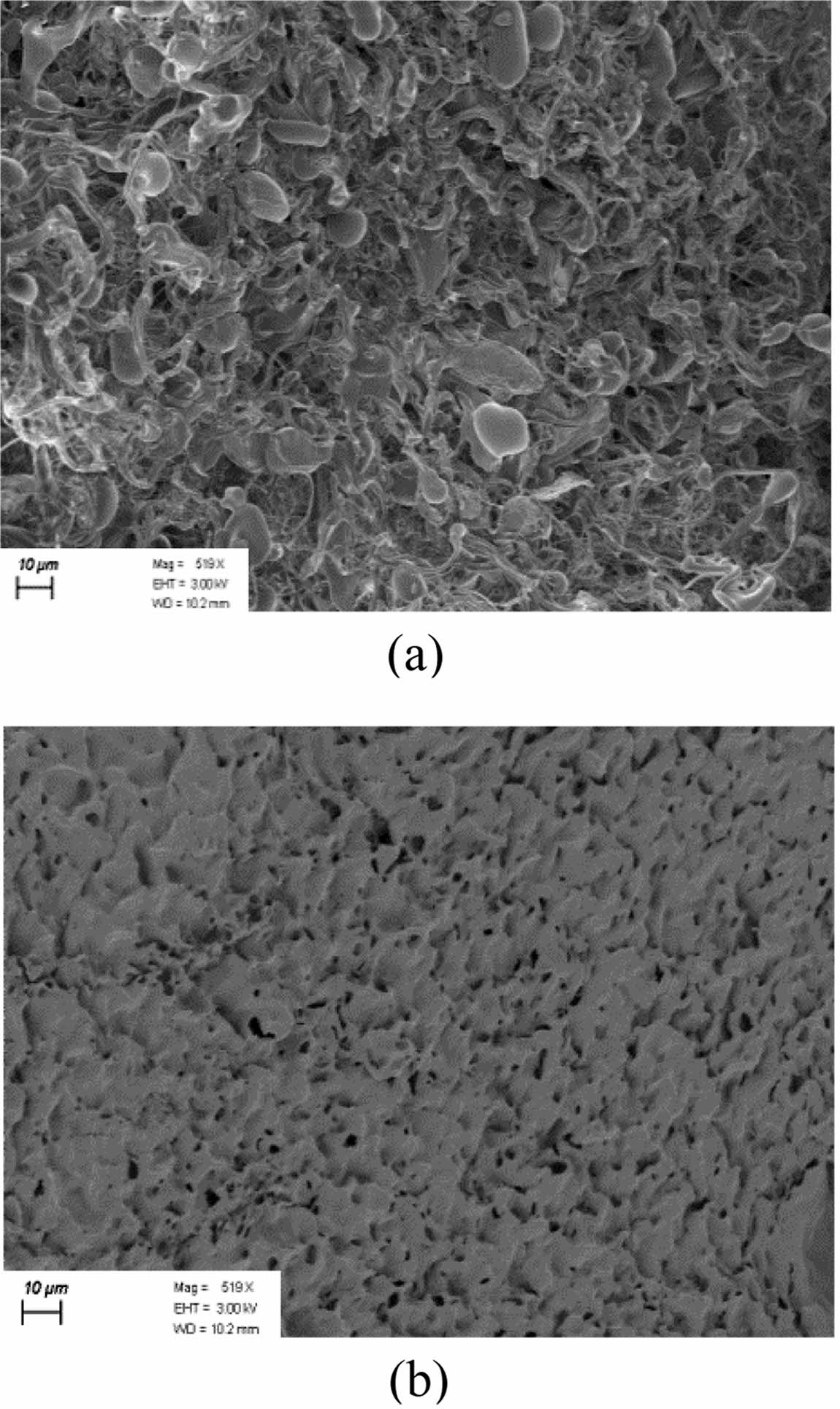 Figure 10 FE-SEM images (×500) of freeze-dried CE0.75-H0.39-HEC hydrogel swollen (a) below LCST (at 25 oC); (b) above LSCT (at 50 oC). Scale bar=10 μm. |