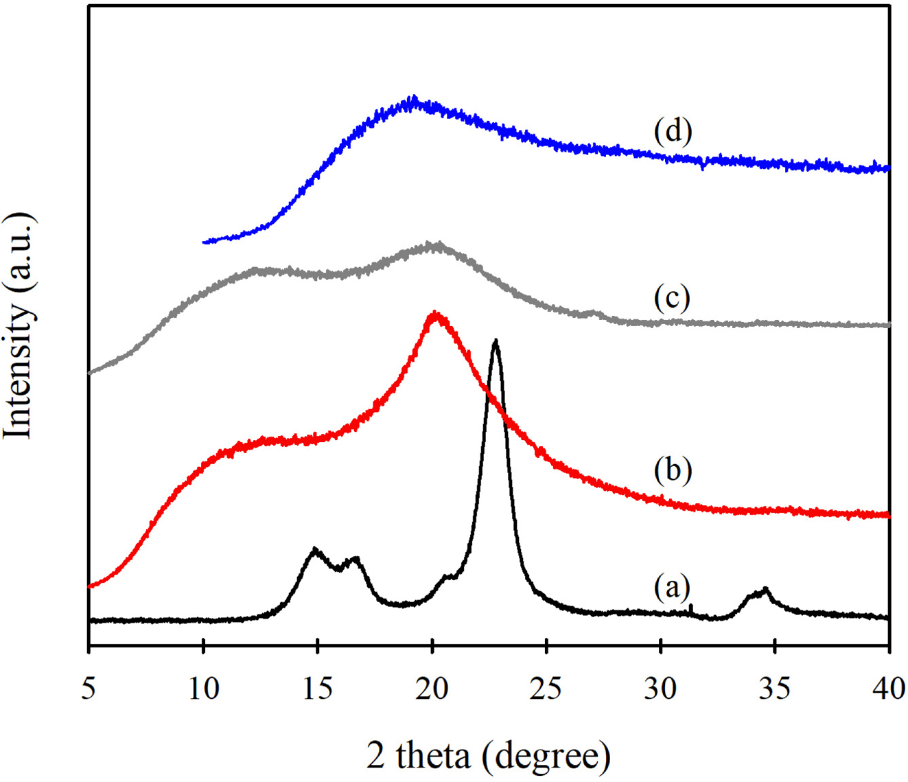 졌다. 이에 비하여 H0.39-HEC를 ECH로 가교시킨 CE0.75-H0.39-HEC는 2q=19o 부근에서 브로드한 무정형 halo만29 나타내고 있을 뿐 결정격자에 의한 회절 피크들이 전혀