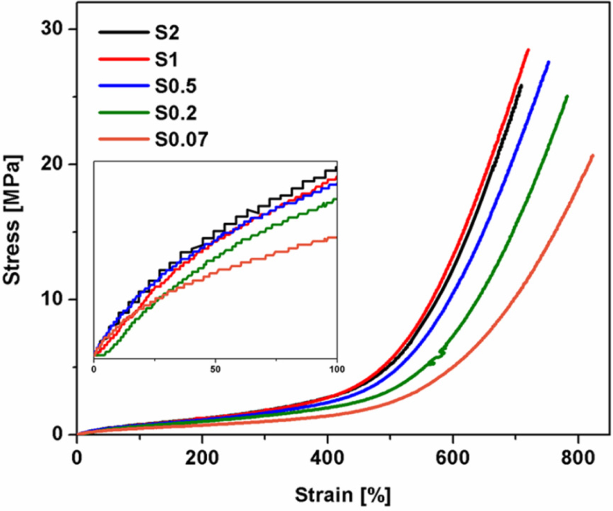Figure 2 Stress-strain curves of NR vulcanizates with various S/