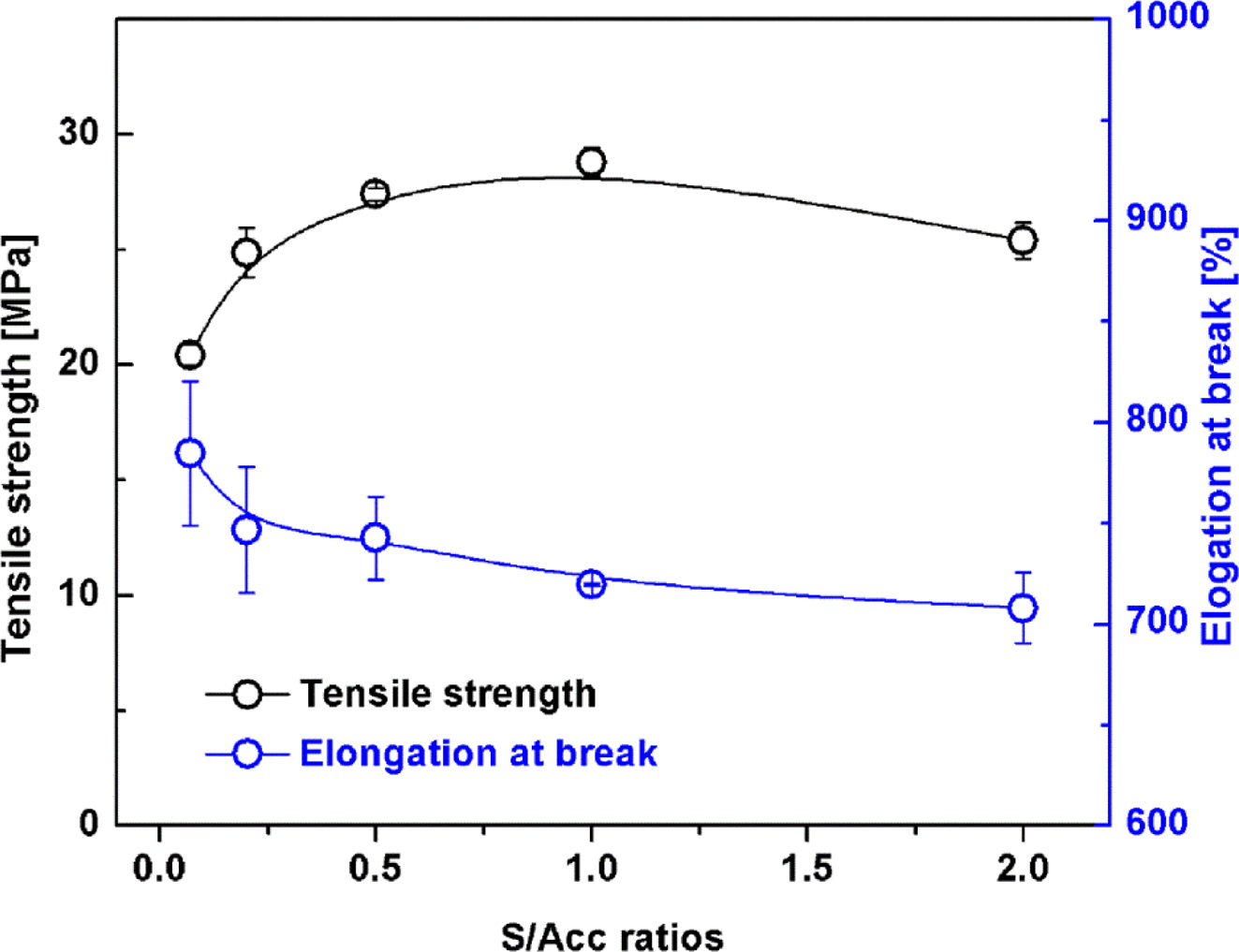 strains also increased with the S/Acc ratio, but the highest tensile strength