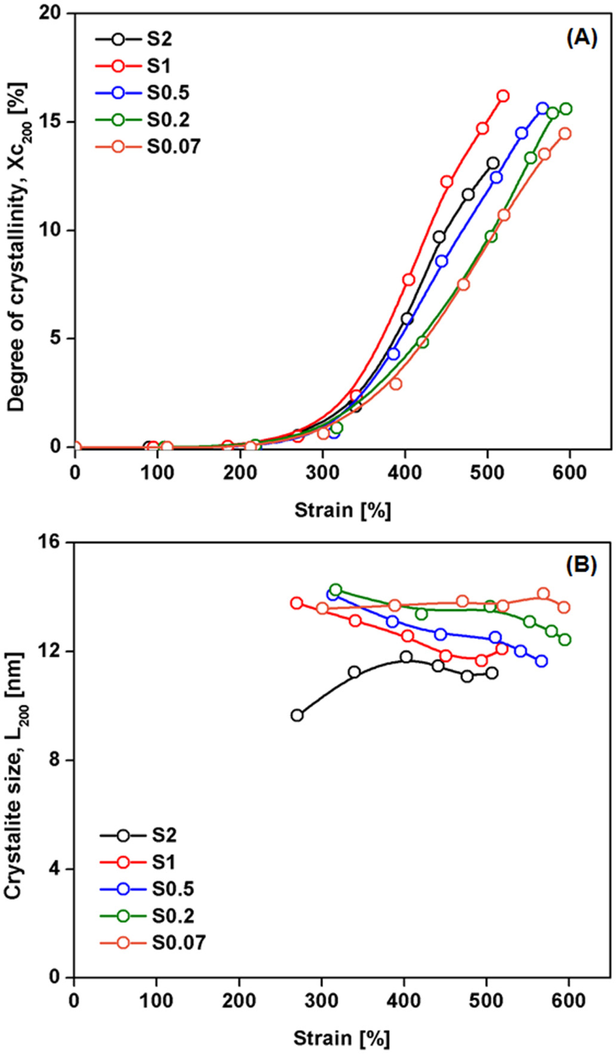 Figure 6 Plot of (A) degree of crystallinity (%); (B) lateral crystallite size corresponding to the (200) plane during stretching of the