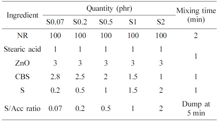 In this study, effects of various sulfur to accelerator (S/Acc) ratios,