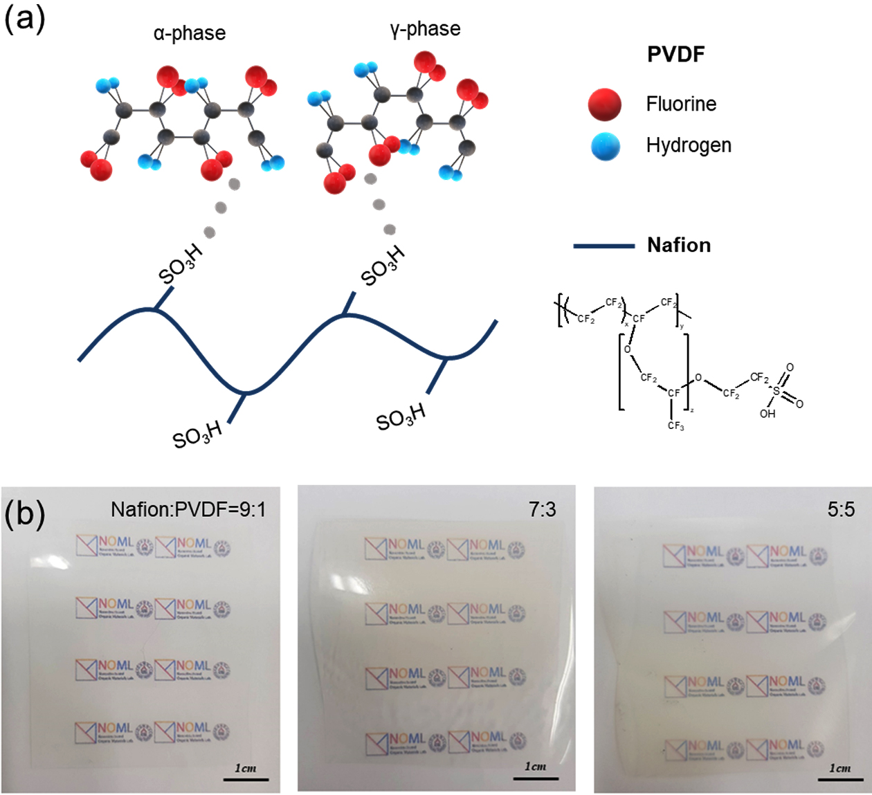 Figure 1 (a) Schematic illustration of Nafion-PVDF blend molecules; (b) images of blend membranes with blending ratios of 9:1,