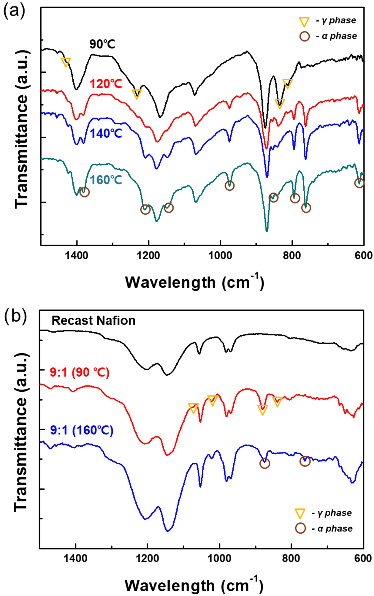 PVDF 고분자가 용액 상태에서 막으로 제작되는 건조 및 열처리 조건에 따라 고분자 주사슬이 재배열되어 각각 α 상과 γ 상의 구조를 이루었다. Nafion의 경우, 불소로 인해