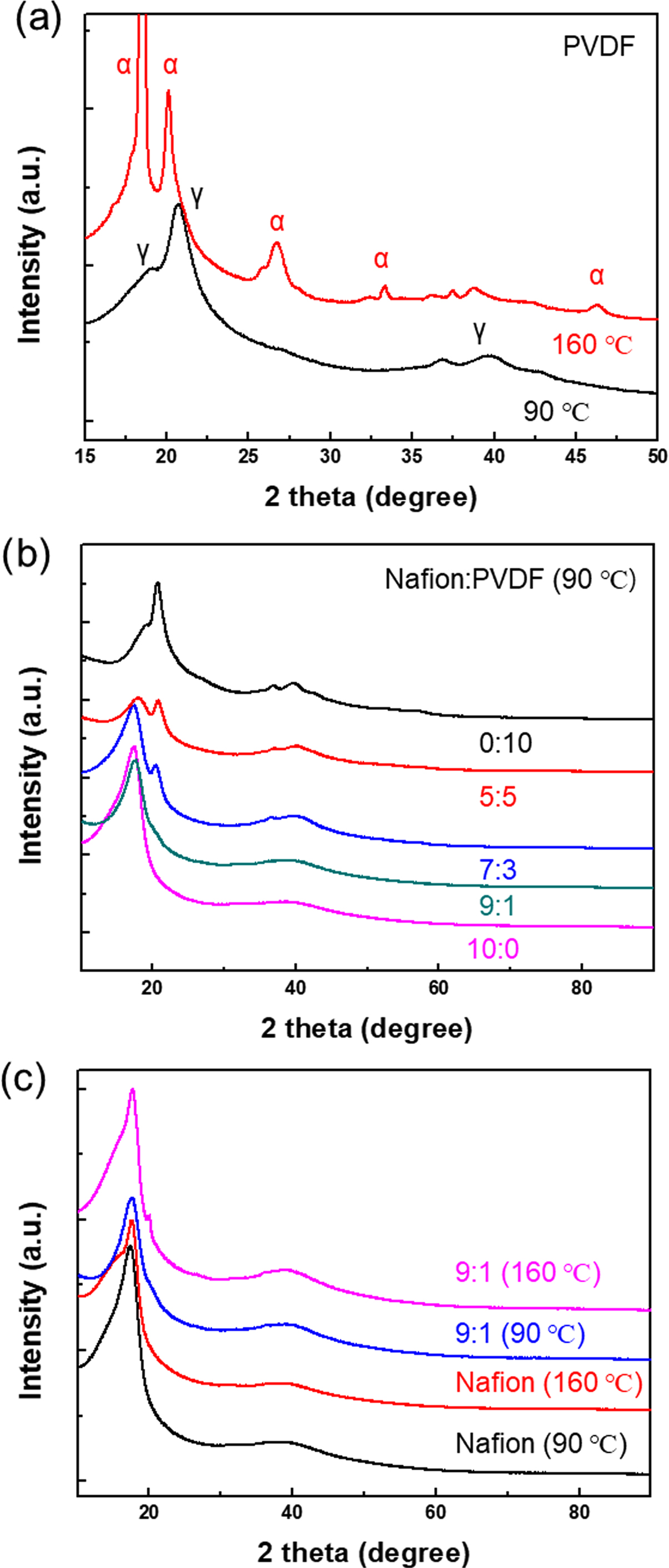 9:1 Nafion-PVDF 블렌드 막의 경우, 90 oC 조건의 막에서는 γ-PVDF를