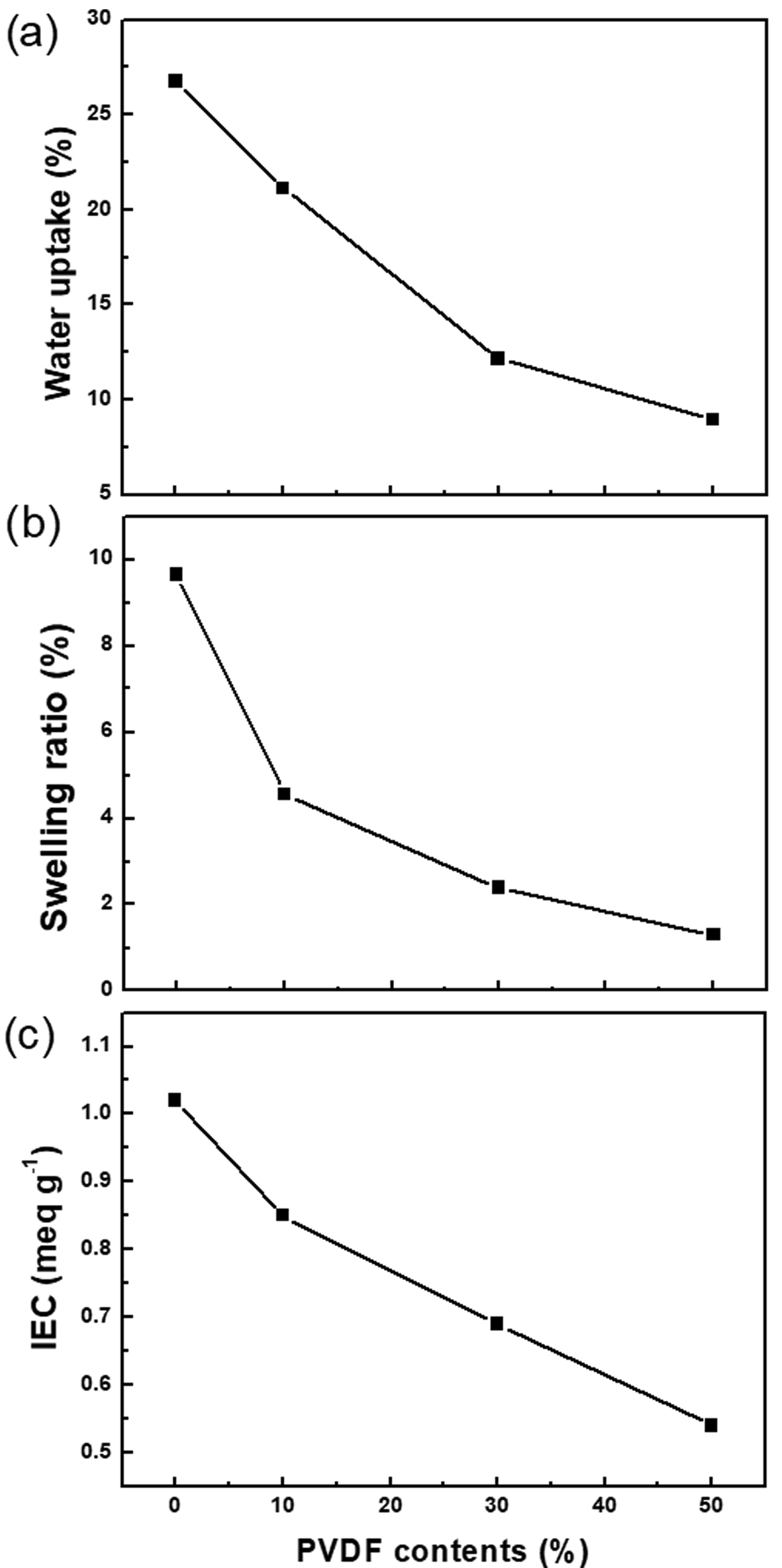 PVDF의 함량이 증가될수록 water uptake와 swelling ratio, IEC가 감소하는 것을 확인하였다. 더불어, 전해질 막의 열처리