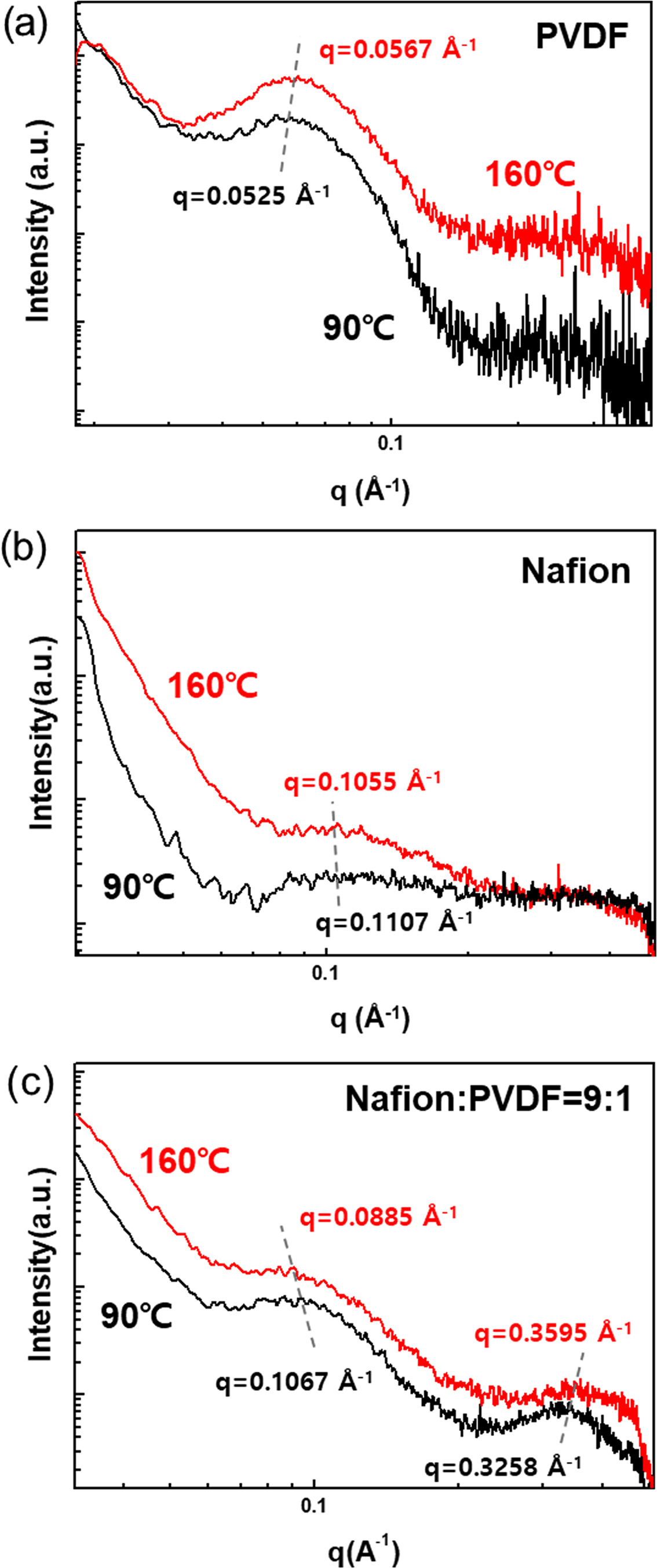 Figure 6(c)의 9:1 비율로 혼합된 Nafion-PVDF의 경우, 90, 160 oC 조건에서 각각 5.88, 7.10 nm의 매트릭스 피크를 나타냄을 확인할 수 있다. 이는