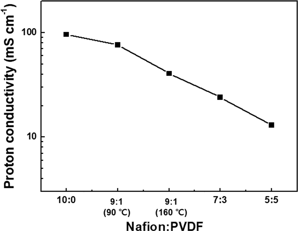 순수한 Nafion에 비해, PVDF가 혼합되면서 이온전도도가 96.02에서 12.97 mS cm-1까지 감소함을 확인할