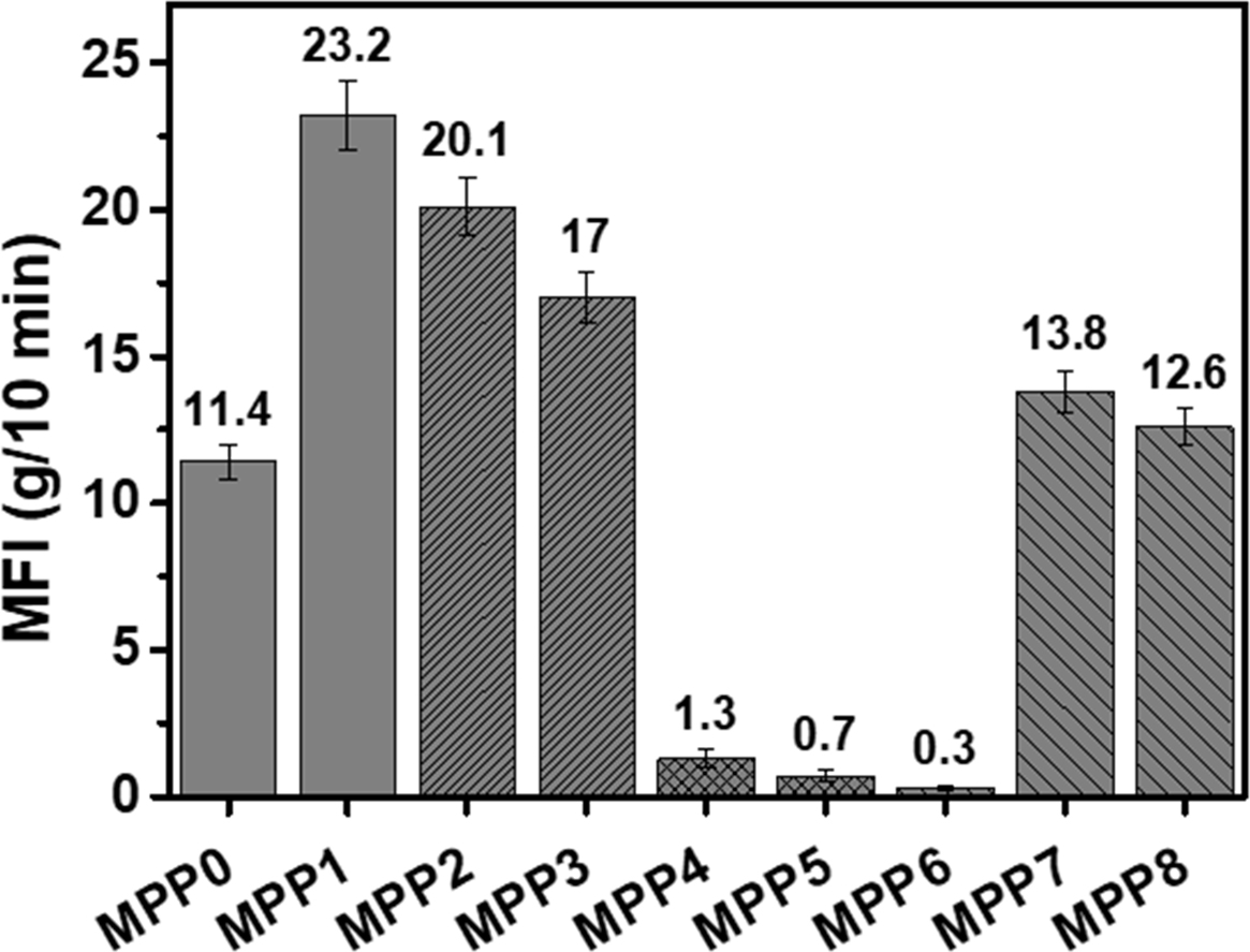 MPP4, MPP5, MPP6의 MFI가 상대적으로 매우 낮은 것을 확인할 수 있었다. 이는 개질제와 PP의 반응에서 TMPTMA는 비교적 자유