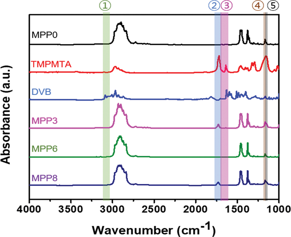 TMPTMA에 존재하는 C=O 신축 진동, 1630 cm-1 부근의 ③ 피크는 TMPTMA와 DVB에 존재하는 C=C 신축 진동을 나타낸다.