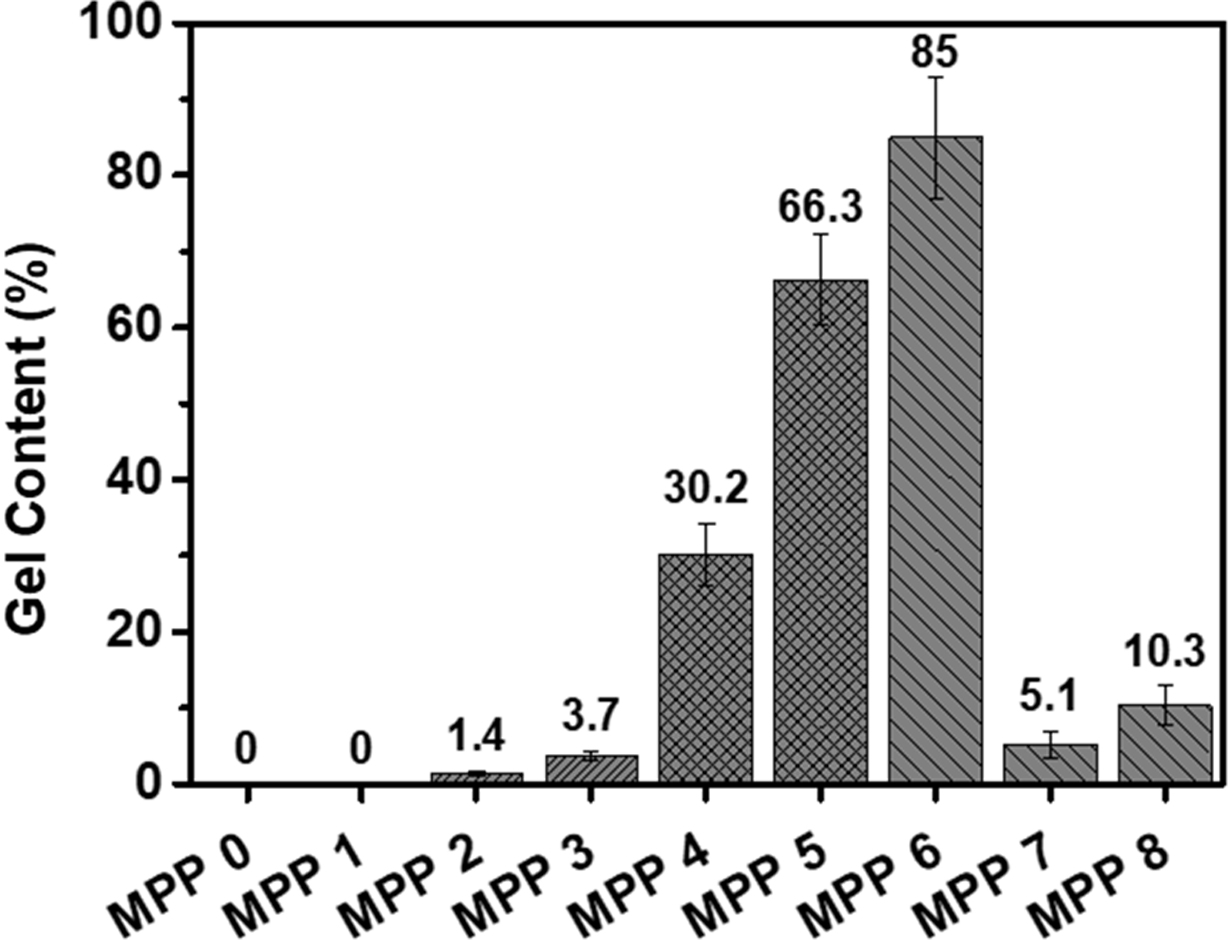TMPTMA보다 DVB에서 더 많은 가교가 형성된 것을 의미한다. 그리고 복합 개질제가 도입된 MPP7과 MPP8의 가교도는 TMPTMA만 들어간