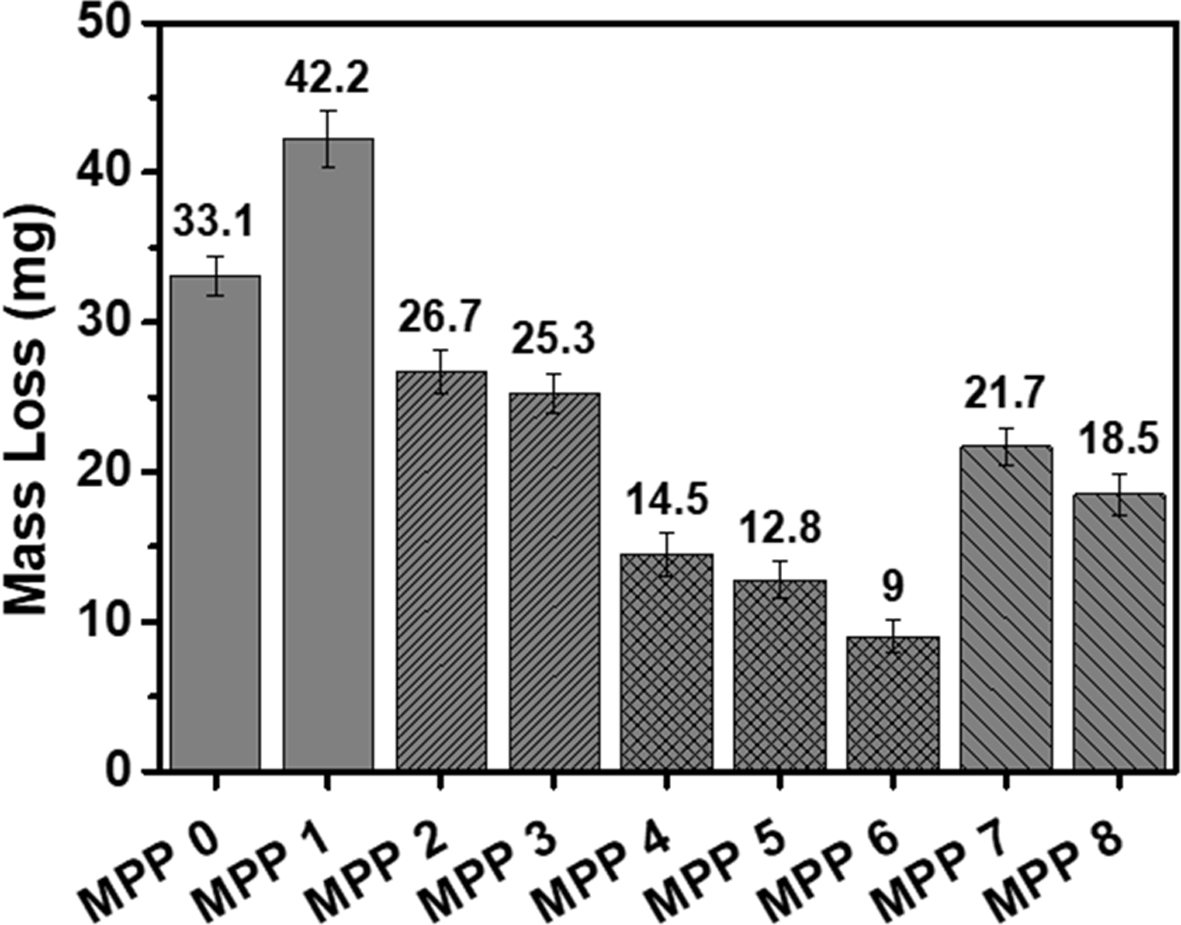 그리고 MPP1과 비교하여 마모에 의한 질량 손실이 적었다. 이것은 PP의 분지화 및 가교로 인해 내마모성이 개선된 결과로 해석된다.25,26 내마모도에 대한 복합 개질제의 효과는 개질제의 총량을 5 phr로 도입한 MPP3, MPP6 그리고 MPP8의