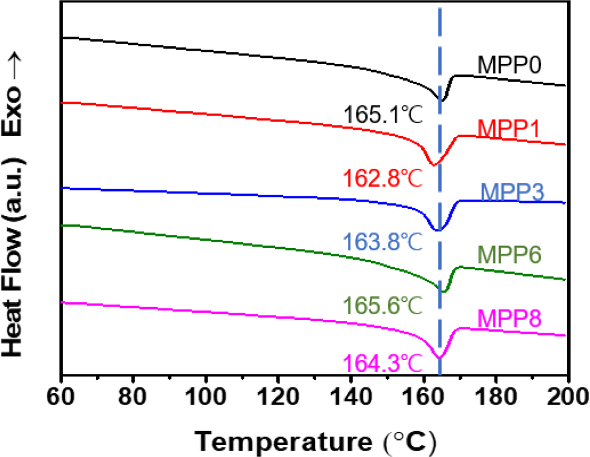 165.1 oC의 용융 온도를 보였다. 개시제만 첨가된 MPP1의 경우 용융 온도는 162.8 oC로 낮아졌는데 이는 b-scission 반응으로 인해 PP 사슬의 절단이 일어나