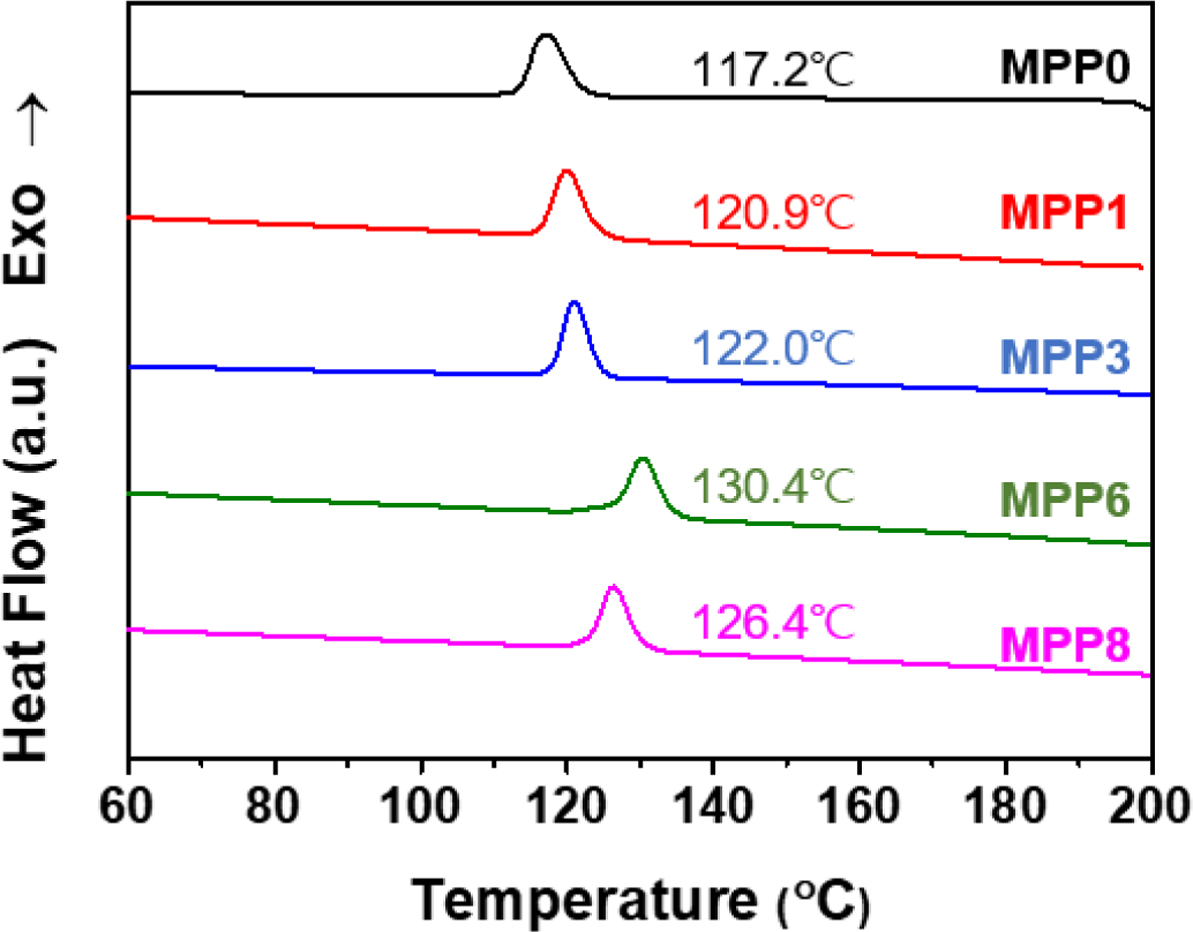 상승하였다. MPP1은 MPP0과 비교하여 결정화 온도가 3.7 oC 상승하였는데 b-scission 반응으로 인해 사슬의 길이가 짧아짐에 따라 핵을 생성하는 것이 쉬워졌기 때문이다.28 또한 개질제의 도입으로 개질된 PP의 결정화 온도는 MPP6, MPP8, MPP3 순으로 높게 나타났다. 이는 분지화 및 가교로 인한 불균일한