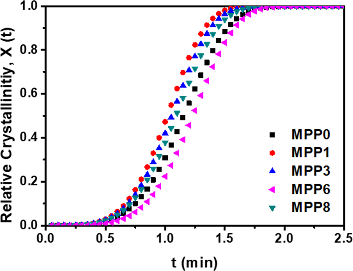 MPP3과 MPP8은 MPP0에 비하여 결정화가 완전히 이루어지는데 걸리는 시간이 빠른 것으로 나타났다. 이는 β-scission 반응으로 사슬이 짧아짐에 따라 분자 운동이 활발해졌기 때문이다. 반면, MPP6의 경우에는