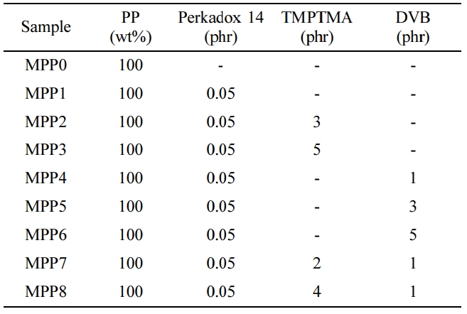 JM350 (MFI=10 g/10 min at 230 oC, 2.16 kg)을 사용하였다. 개질제로 사용한 TMPTMA와 DVB는 각각 Aldrich사와 Samchun사에서 구입하였다.
