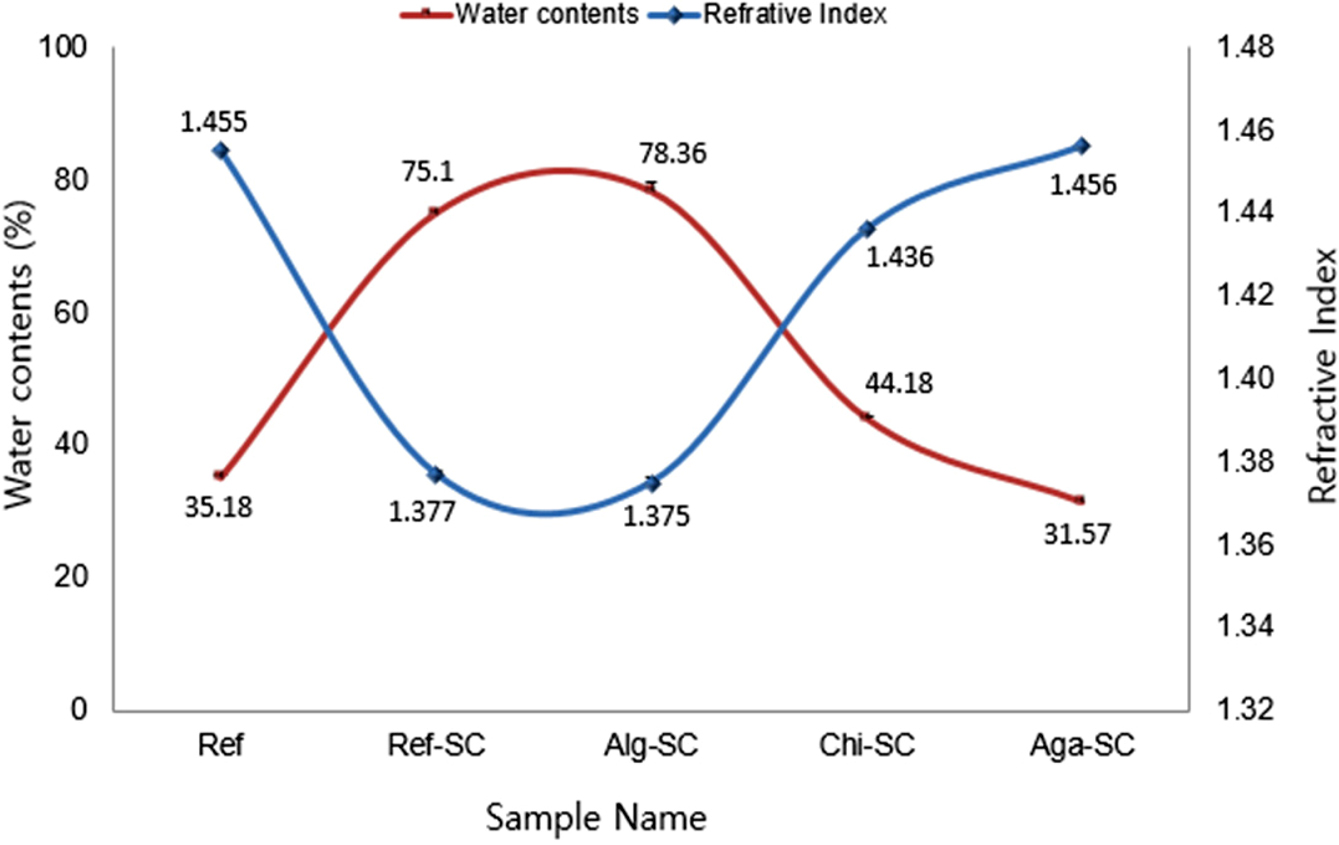 index (blue line) of porous hydrogels contact lenses with ionic polysaccharide. |