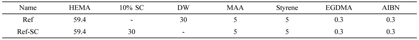 다공성 수화젤 콘택트렌즈를 제작한 후 이온성 천연다당류를 가교시켜 이온성 천연다당류가 콘택트렌즈의 물리적∙화학적 성질에 미치는 영향을 알아보고자 하였다. 다공성 수화젤은 발포제로서 sodium carbonate를 사용하였으며 이온성 천연다당류로서 alginate, chitosan, agarose를 사용하였다. 다공성 수화젤은 일반 수화젤보다 함수율, 산소투과율, 습윤성이 매우 향상되었다. 천연다당류가 결합된 콘택트렌즈는 이온성의 종류에 관계없이