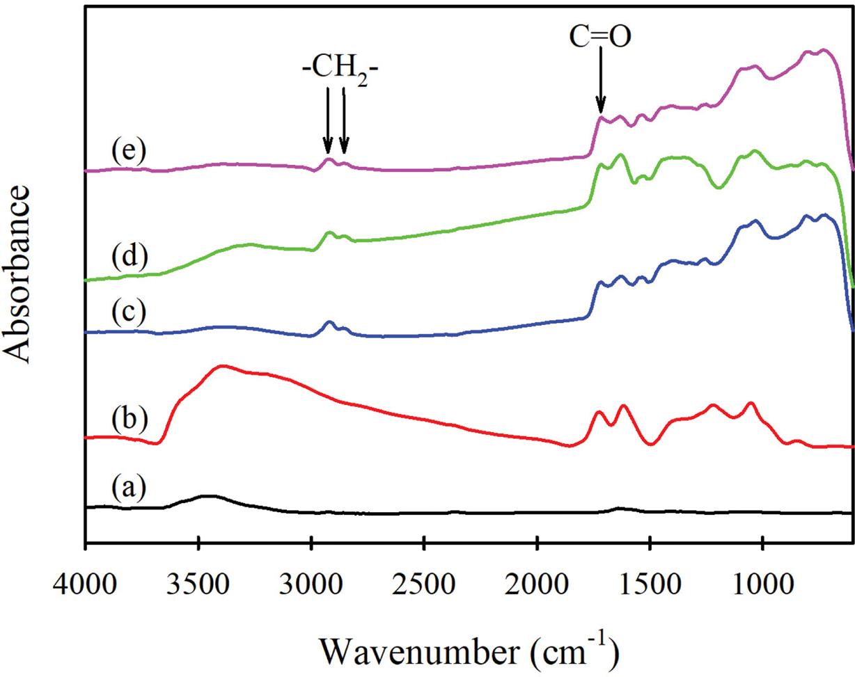FTIR spectra of (a) graphite; (b) GO; (c) GO-g(5.4%)- PCL(530); (d) GO-g(6.4%)-PCL(1250); (e) GO-g(7.8%)-PCL(2000).
