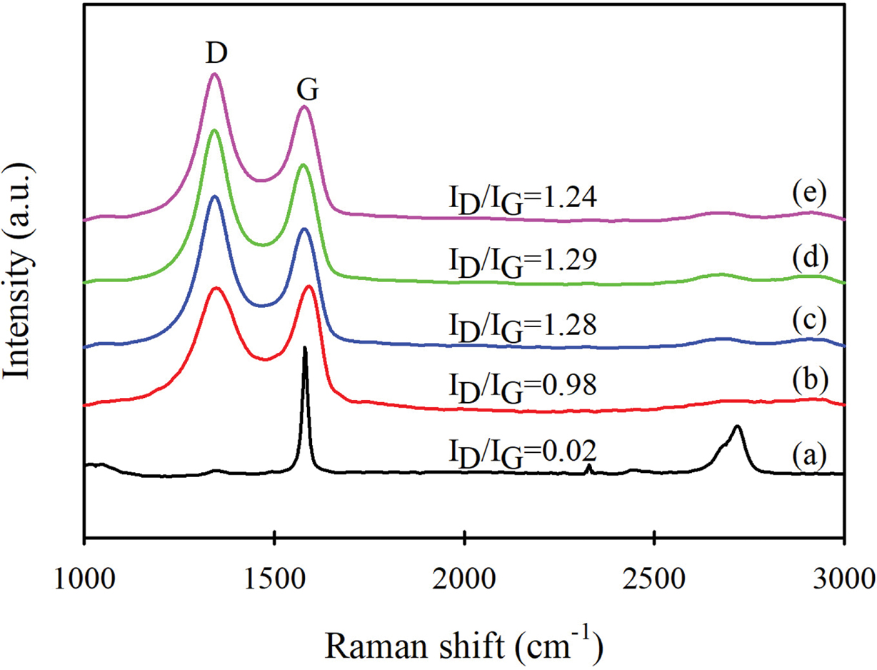 Raman spectra of (a) graphite; (b) GO; (c) GO-g(5.4%)- PCL(530); (d) GO-g(6.4%)-PCL(1250); (e) GO-g(7.8%)-PCL(2000).