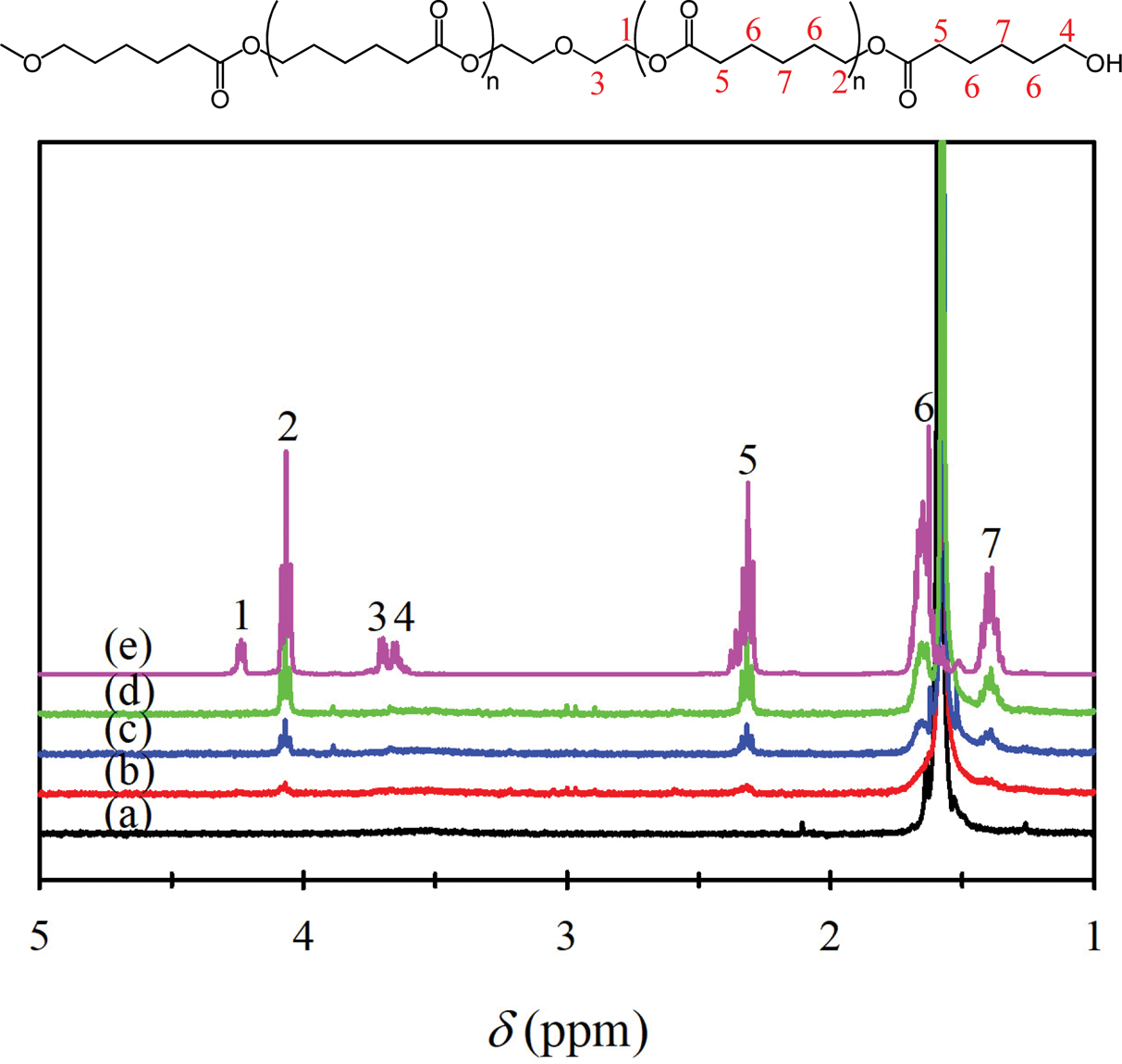 1 H NMR spectra of (a) GO; (b) GO-g(5.4%)-PCL (530); (c) GO-g(6.4%)-PCL(1250); (d) GO-g(7.8%)-PCL(2000); (e) PCL diol (MW 1250 g/mol). Solvent: CDCl3.