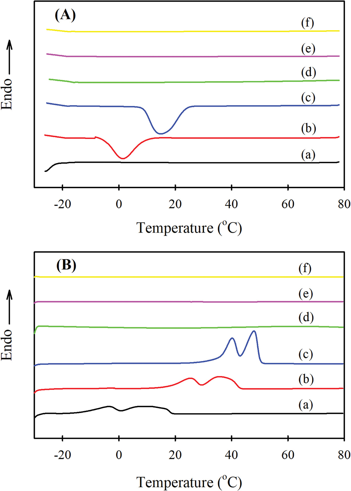 (A) DSC cooling; (B) reheating curves of (a) PCL(530); (b) PCL(1250); (c) PCL(2000); (d) GO-g(5.4%)-PCL(530), (e) GOg(6.4%)-PCL(1250); (f) GO-g(7.8%)-PCL(2000).