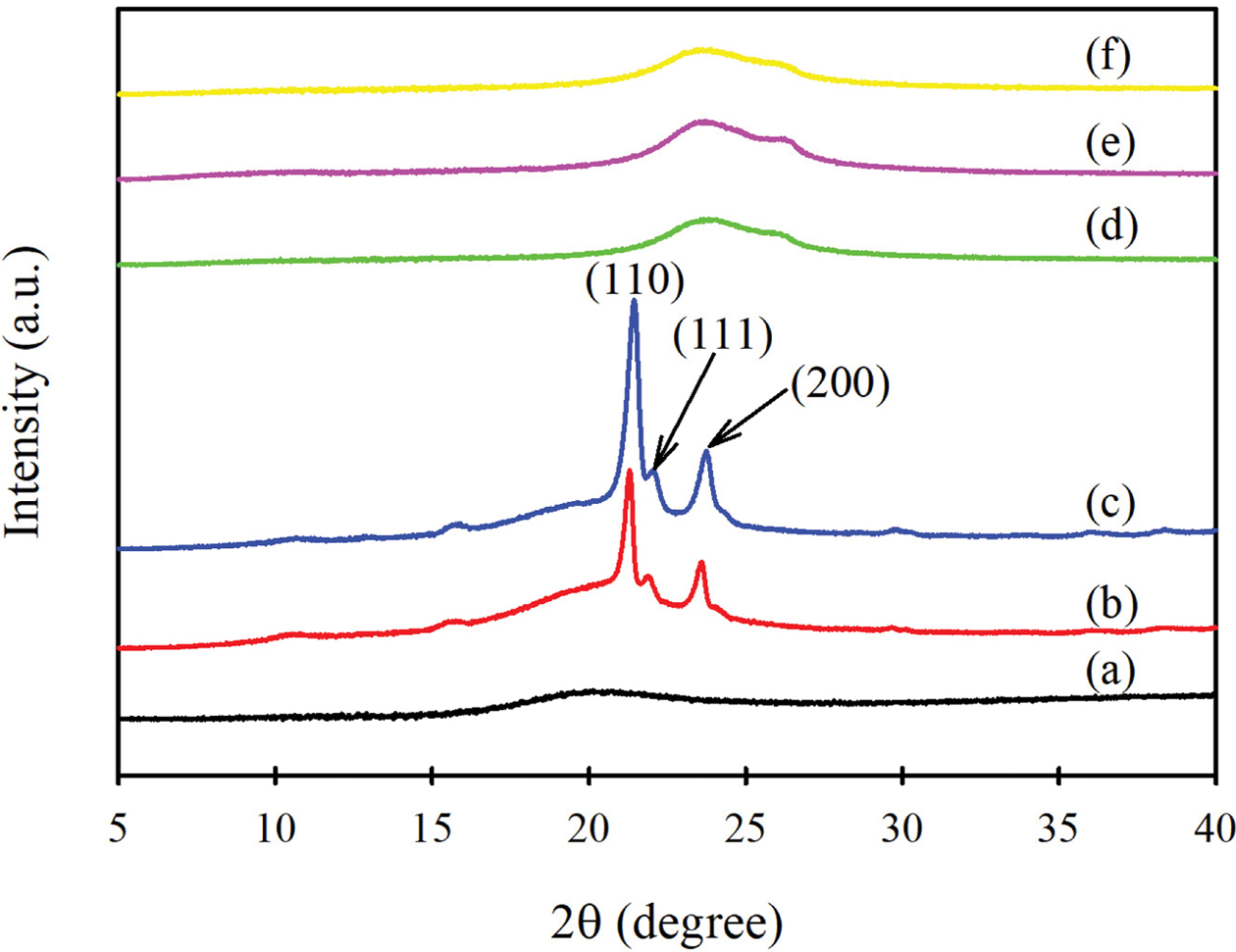 X-ray diffraction curves of (a) PCL(530); (b) PCL(1250); (c) PCL(2000); (d) GO-g(5.4%)-PCL(530); (e) GO-g(6.4%)-PCL (1250); (f) GO-g(7.8%)-PCL(2000).
