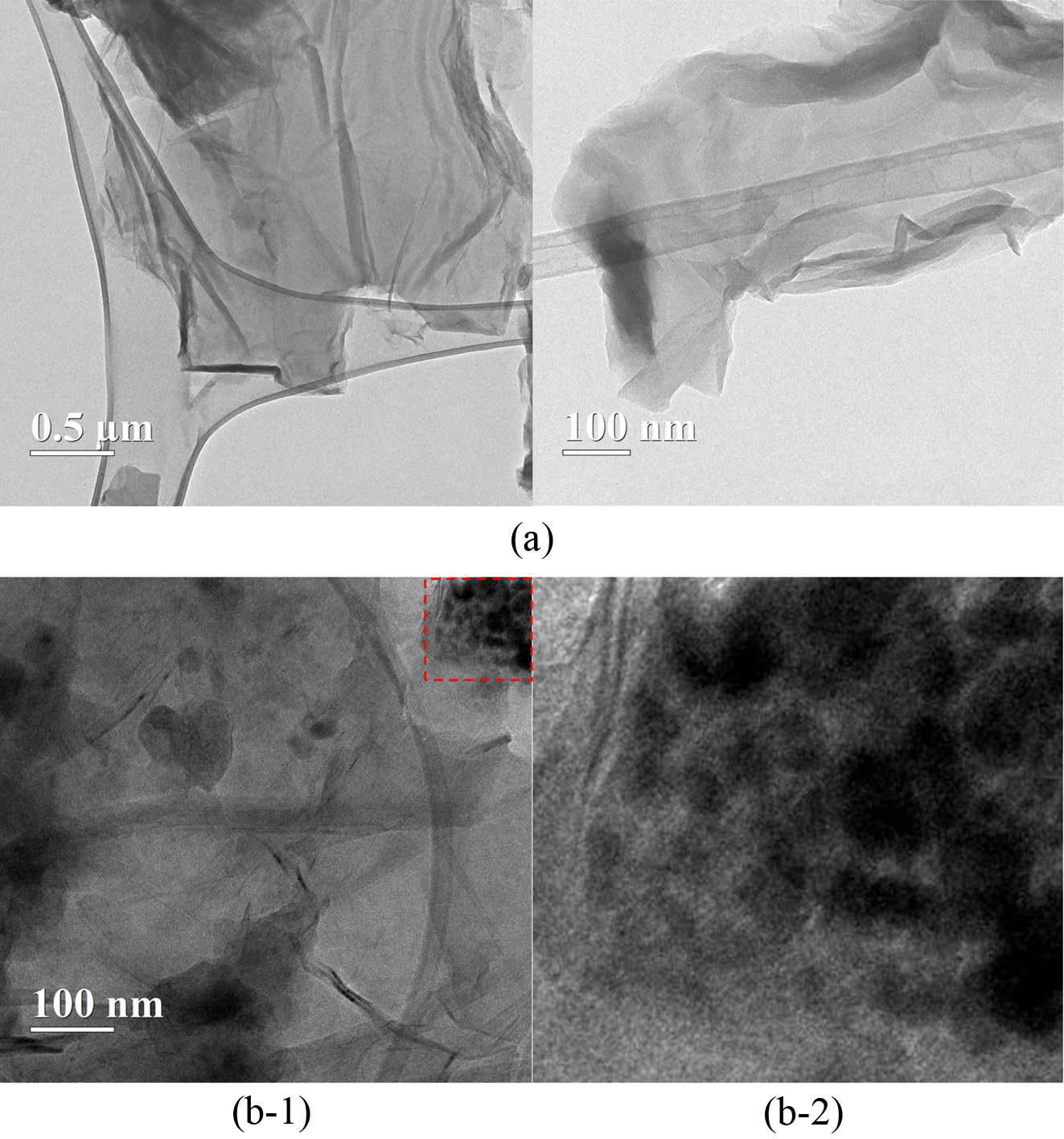 TEM images of (a) GO; (b-1) GO-g(6.4%)-PCL(1250); (b-2) enlarged image of the area indicated by the small square in (b1).