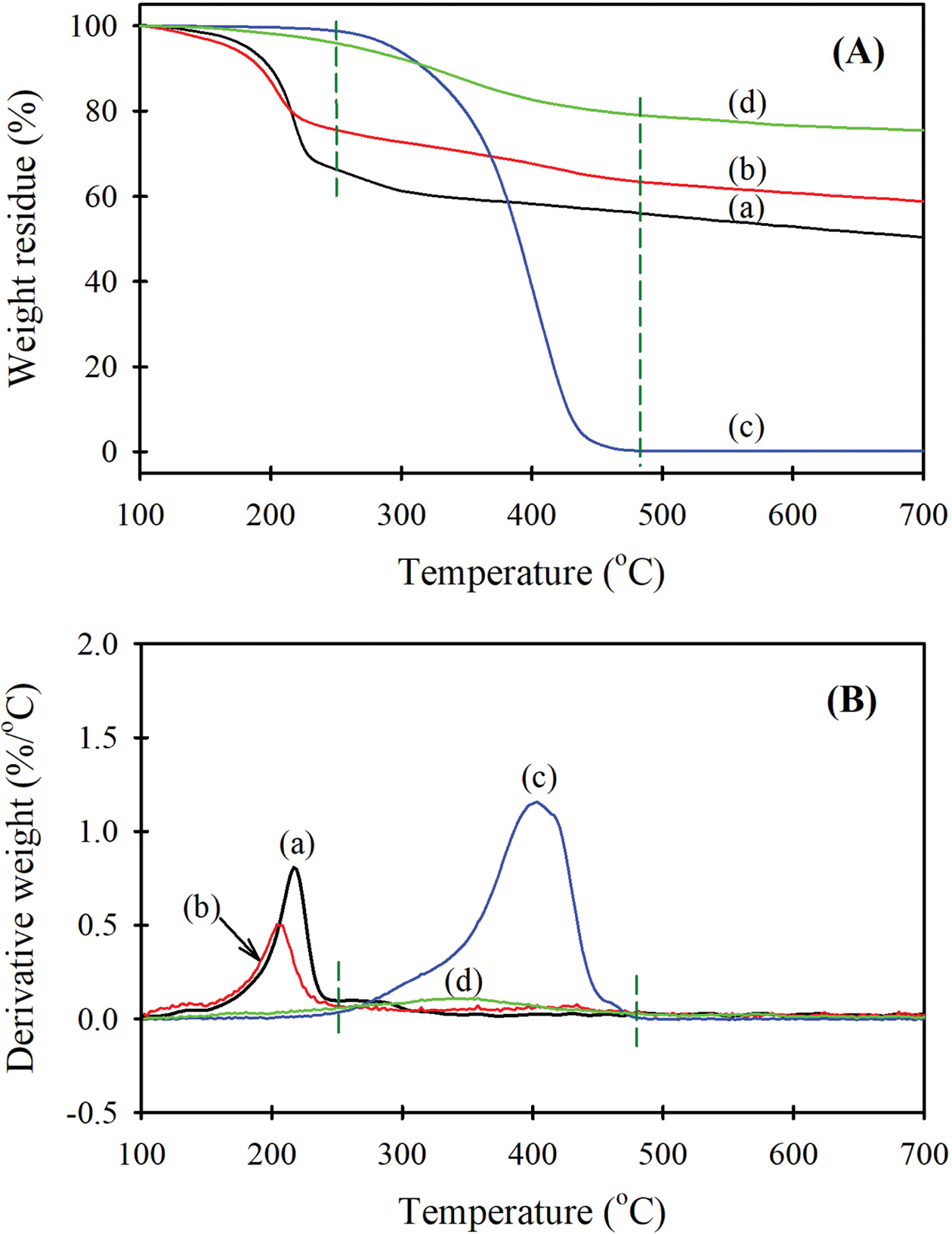 (A) TGA; (B) DTG curves of (a) GO; (b) solvothermal treated GO; (c) PCL diol(1250); (d) GO-g(6.4%)-PCL(1250).